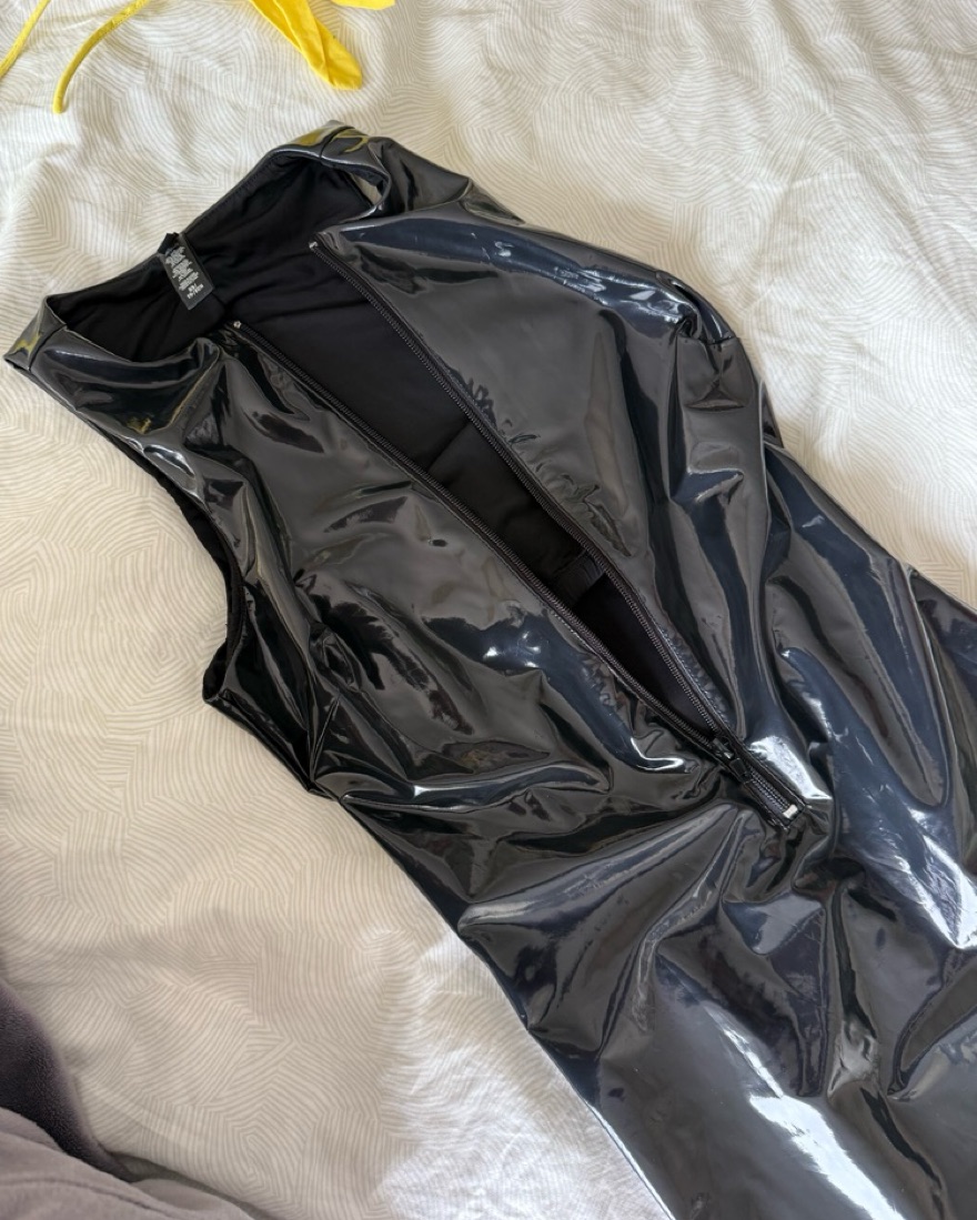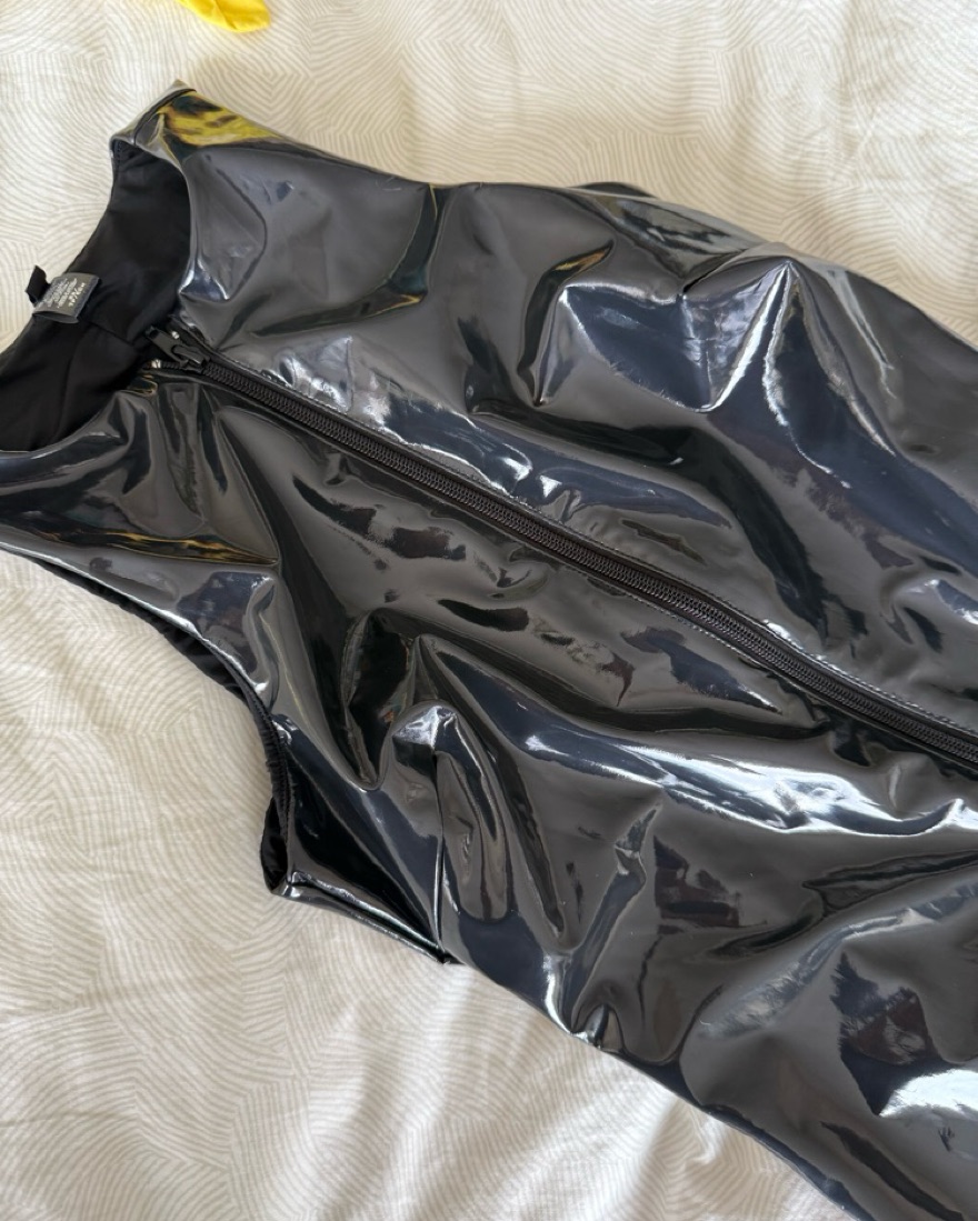 This figure-hugging dress is perfect for a night out on the town. The glossy latex-like material creates a sleek, sultry look that's sure to turn heads. The fabric looks so liquid and cool. Zips half way down the body if you want. Inside is a softer lining.