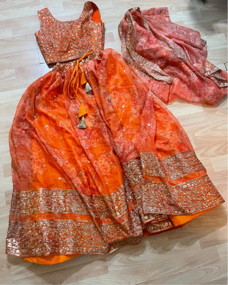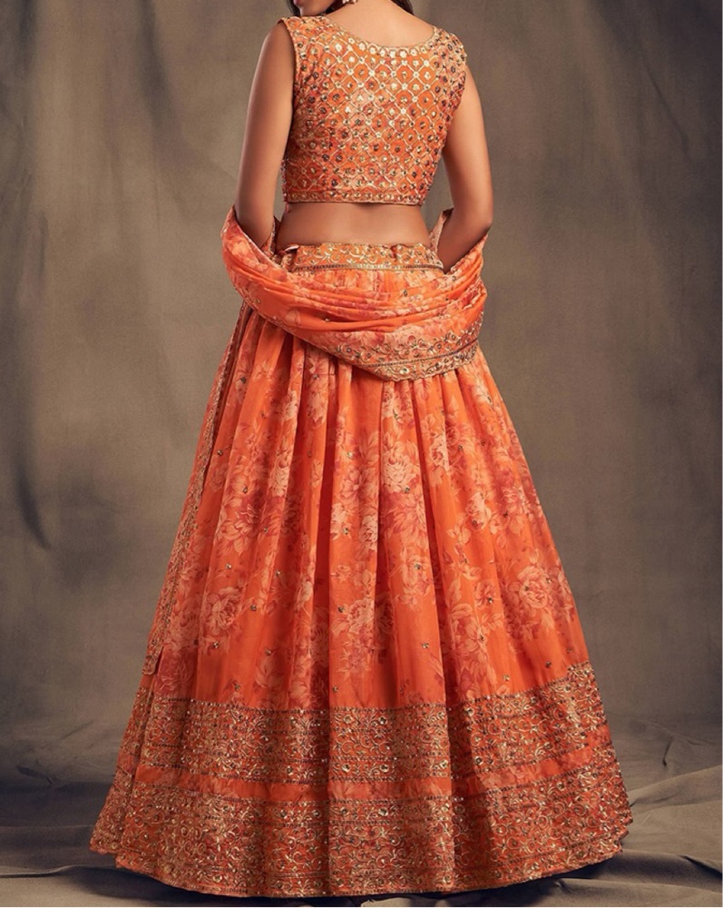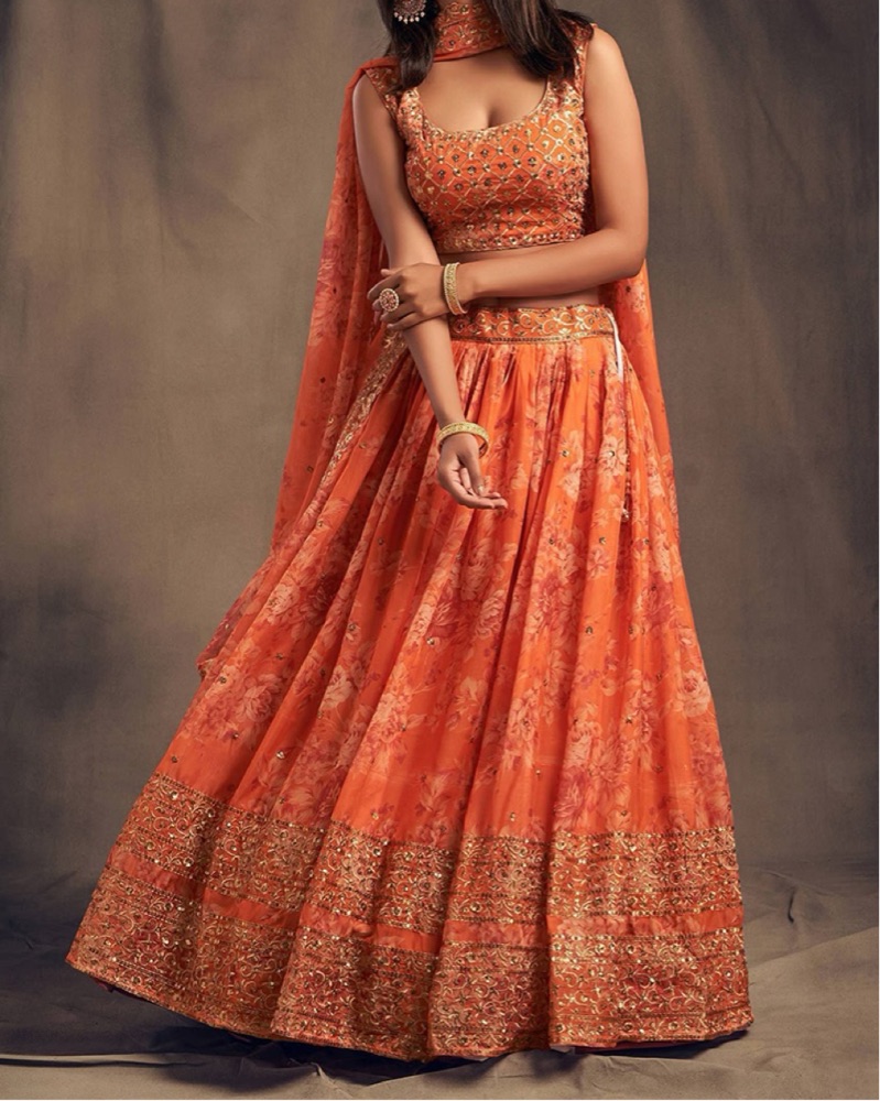 Three piece burnt orange embroidered lehenga set, comes with zippered tank, multilayered skirt, and shawl