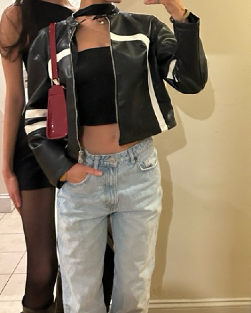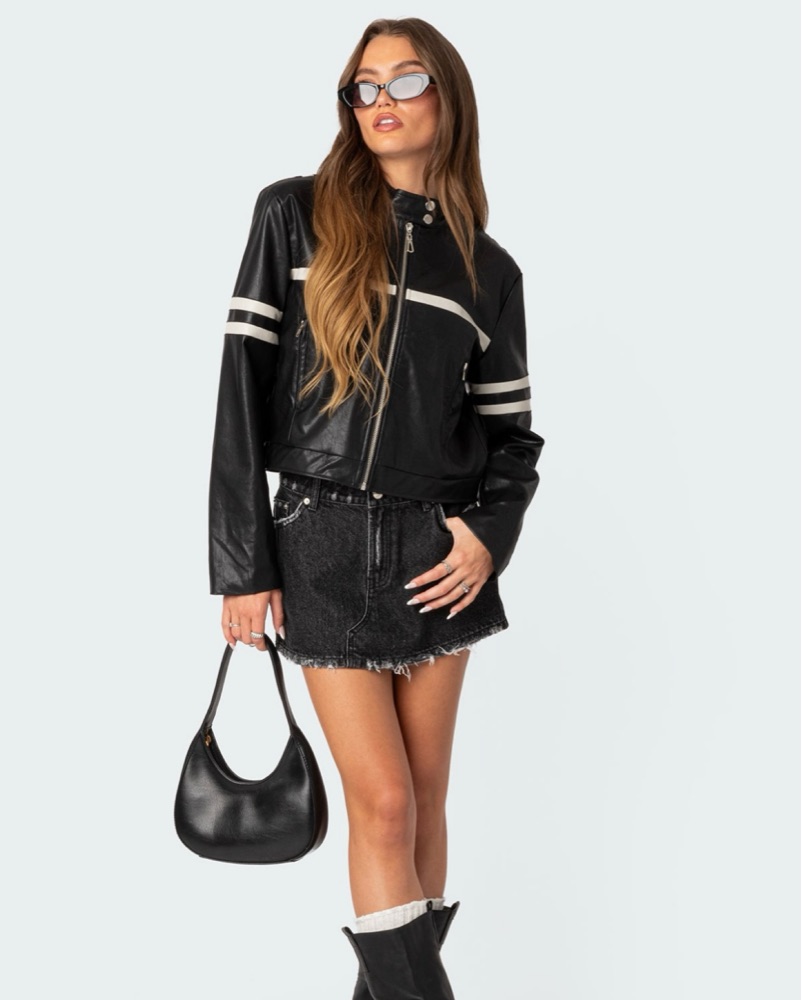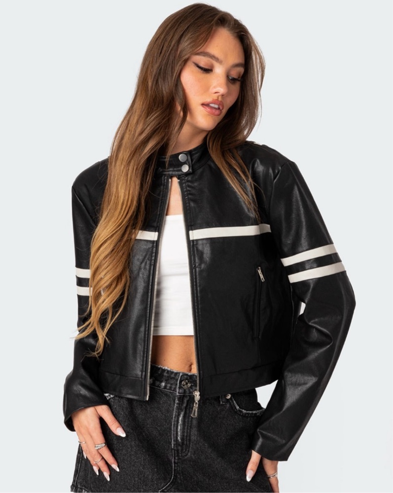 Edikted Faux Black Leather Jacket w/ white detailing — can be worn a ton of different ways!