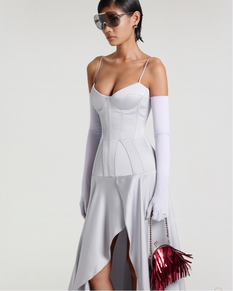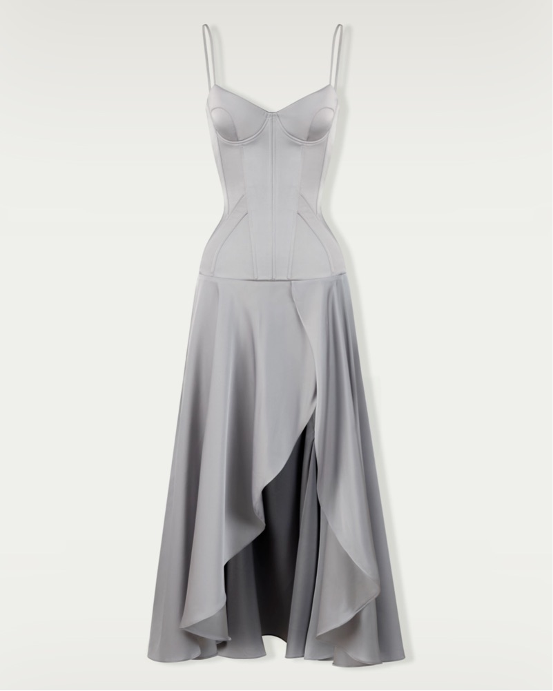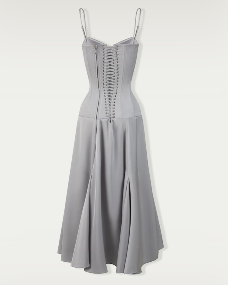 Sweetheart neckline Adjustable spaghetti straps Draped skirt Lacing at back Off-set zip closure at back Partially lined