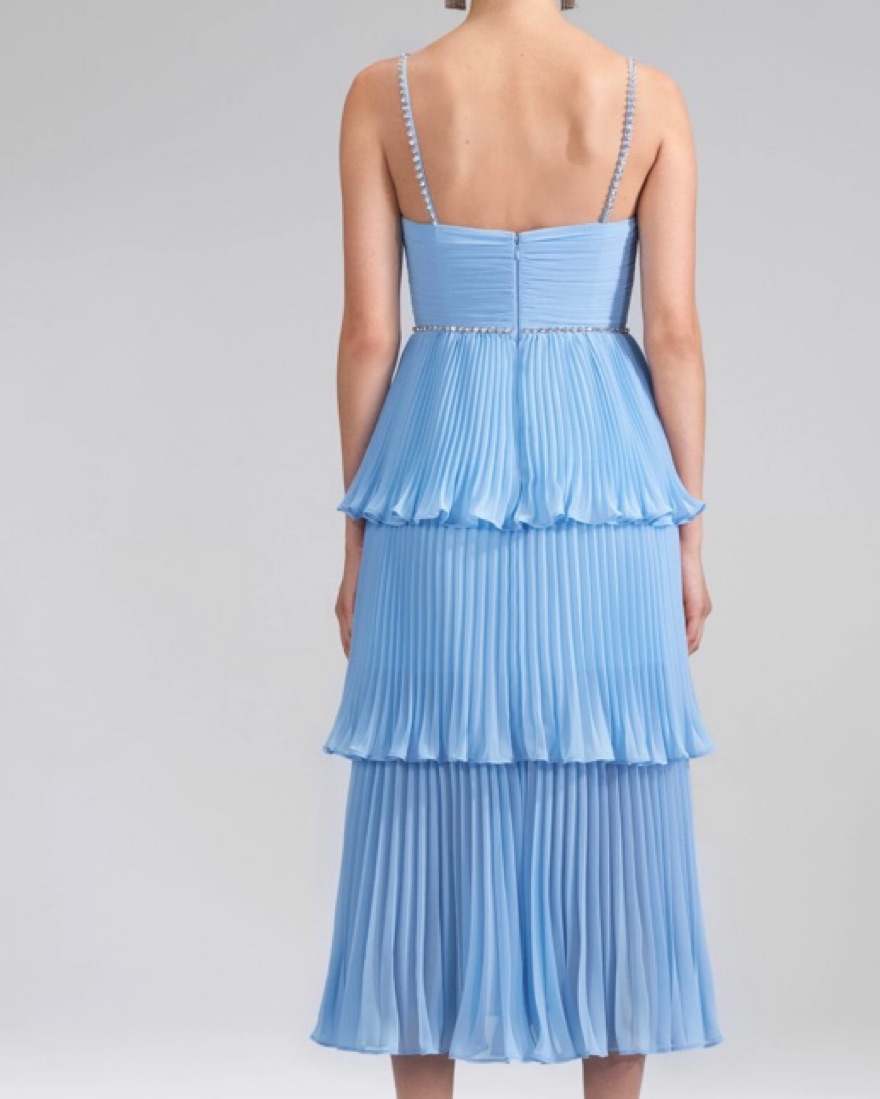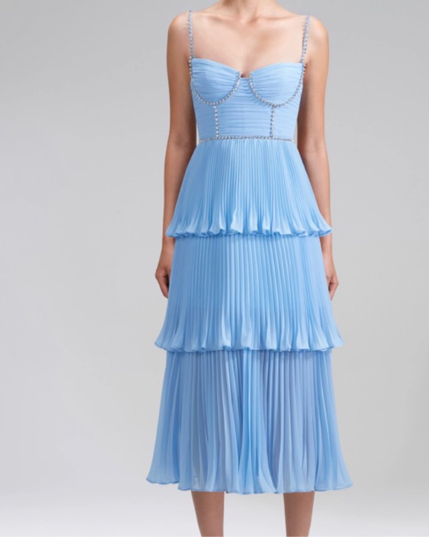 Beautiful blue self portrait chiffon tiered midi dress. Corset type top style. Comfortable and so pretty. Excellent condition. Great for weddings. Size US 4. For reference i am typically a size small, 26 size jeans. Please handle with care. Reach oht with Qs.