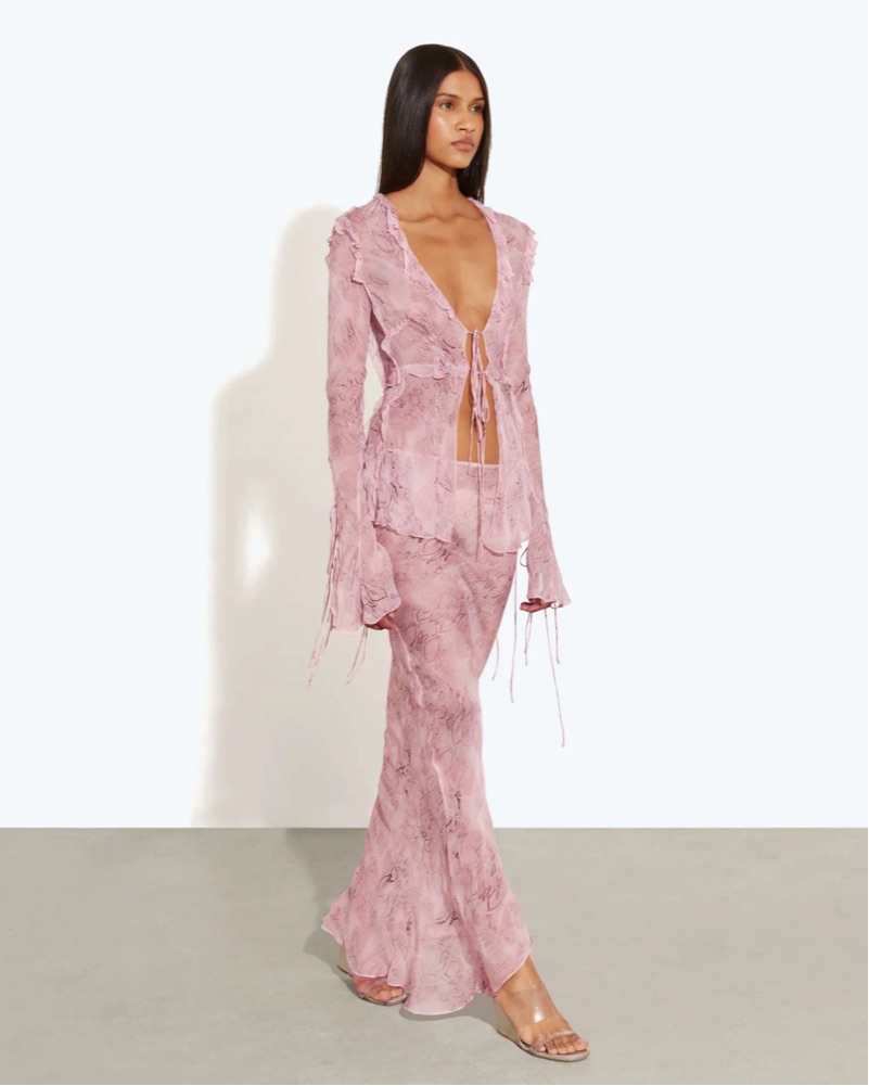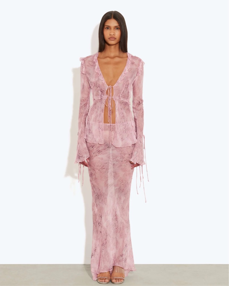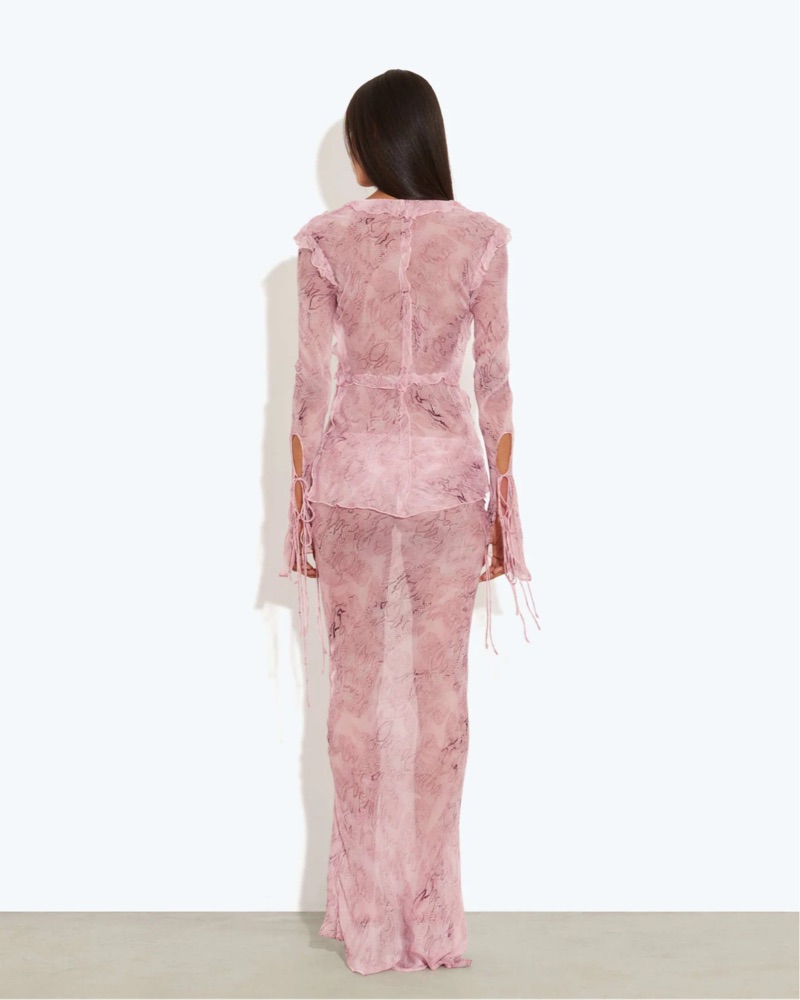 This stunning maxi dress exudes a romantic, feminine aesthetic perfect for special occasions or formal events.