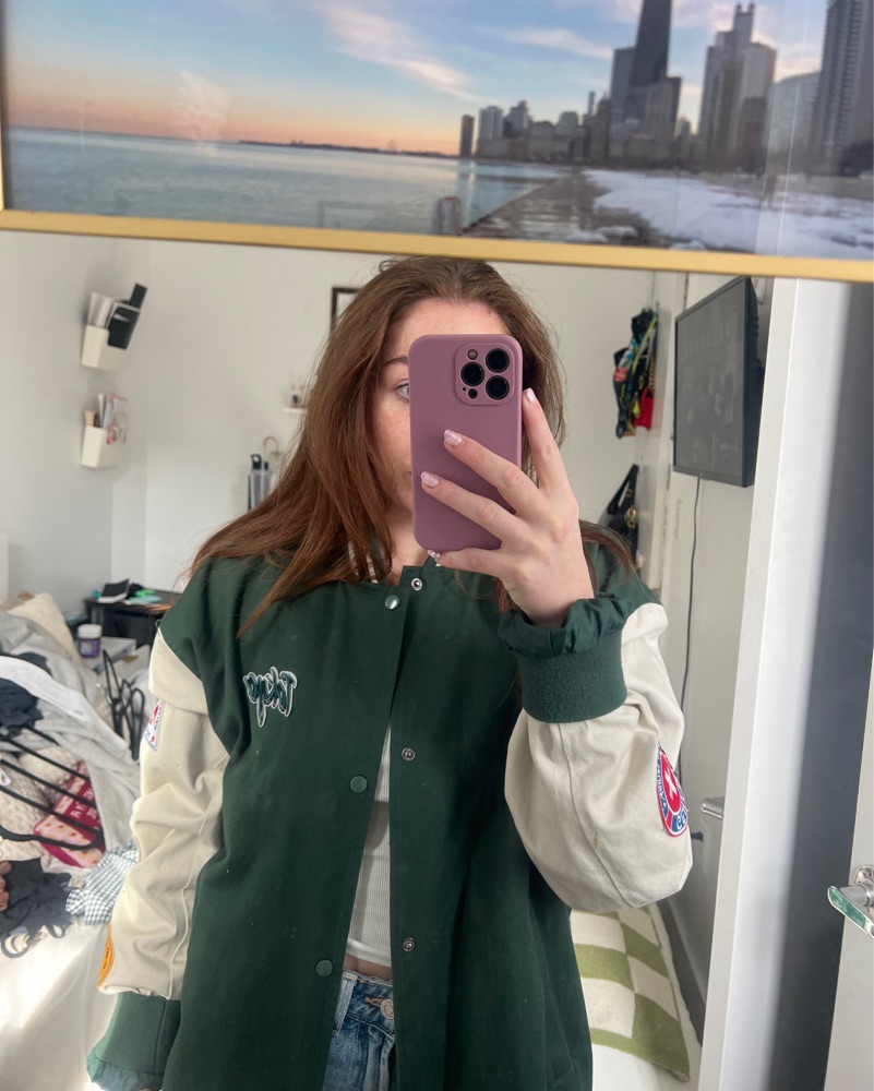 This versatile utility jacket is perfect for pairing with a variety of outfits, from casual jeans to dressier looks. Its bold patches and color-blocking add a unique touch.