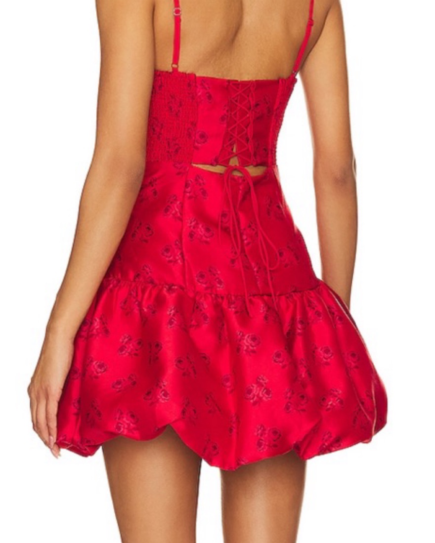 Red mini dress with a ruffle trim and a flirty, flared silhouette.