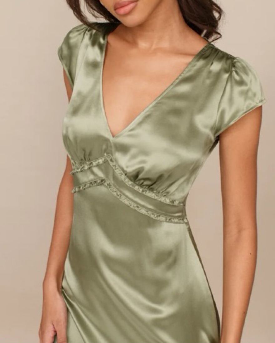 A short sleeve, midi dress with a V neckline and ruffle edged at the bust.