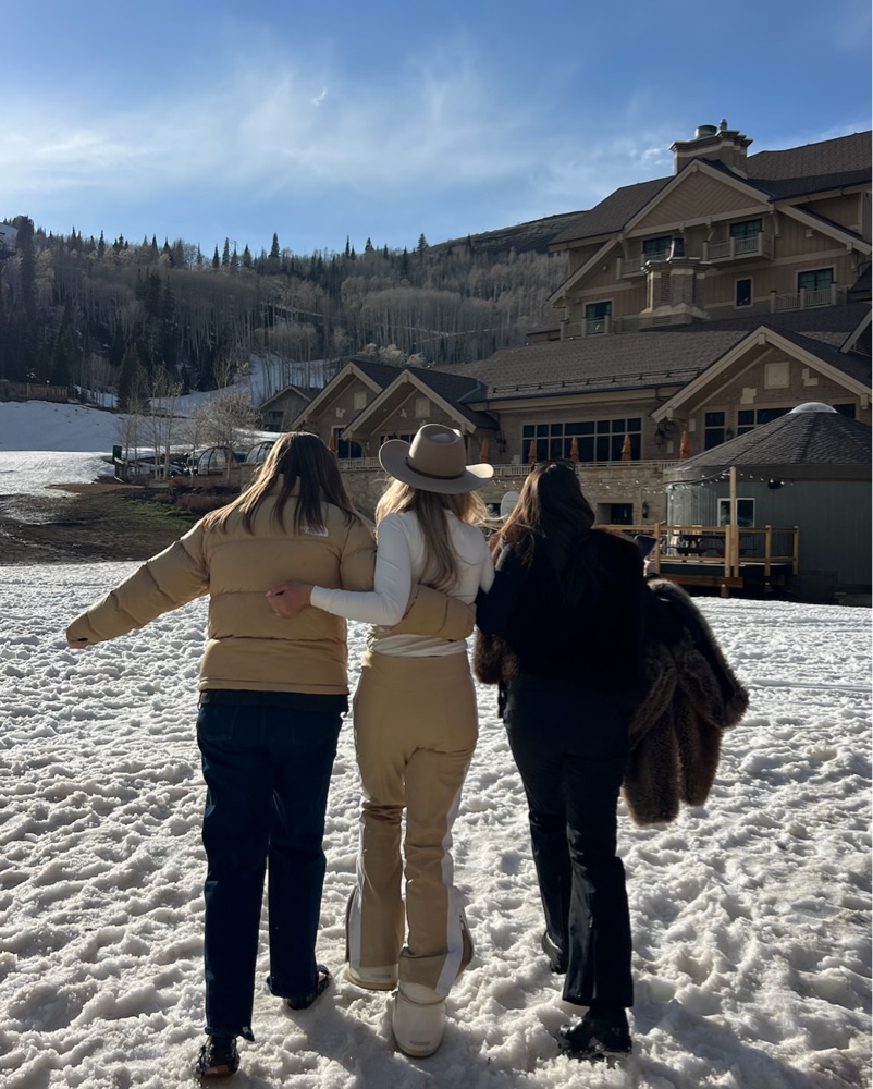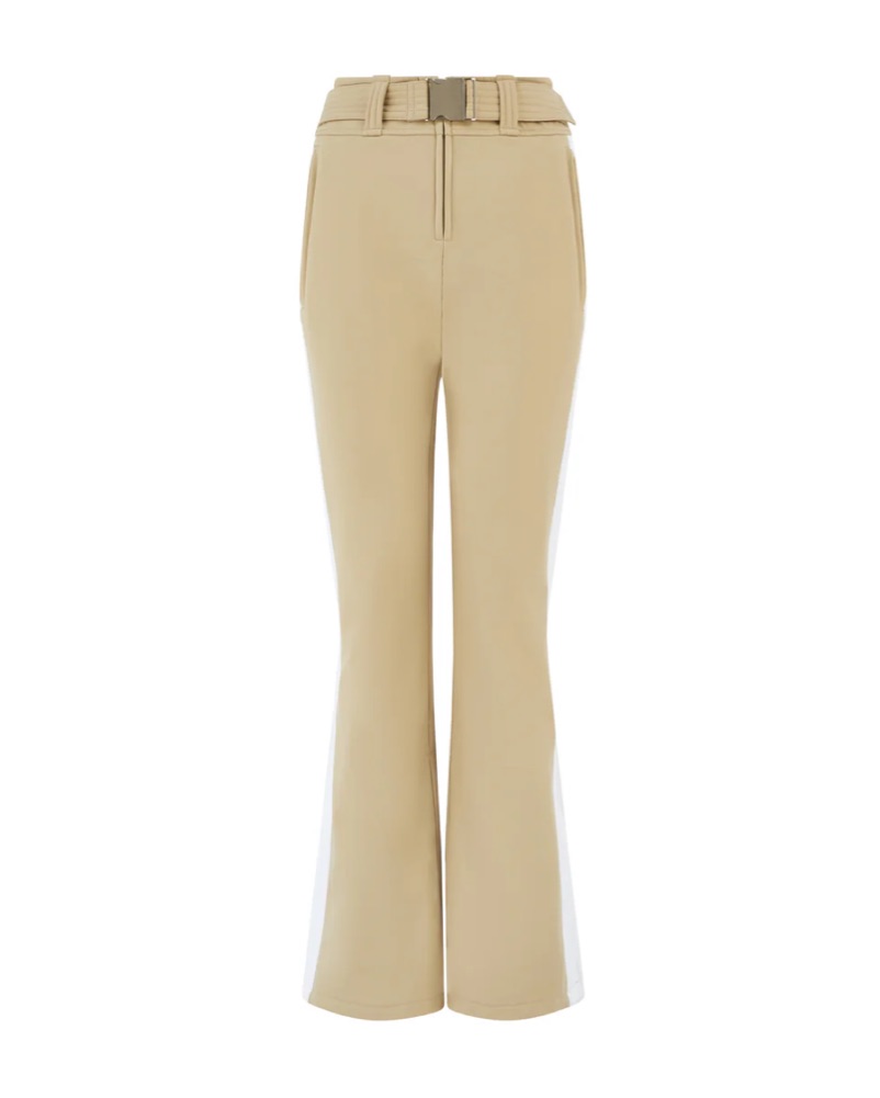The PERFECT ski pants; cut from a water resistant, breathable, stretch shell. The camel perfect ski pants with a white stripe and light gold hardware are flared, flattering and blend function and form. Super cute & match my Goldbergh fringe jacket. Great for skiing & Apres ski 😉