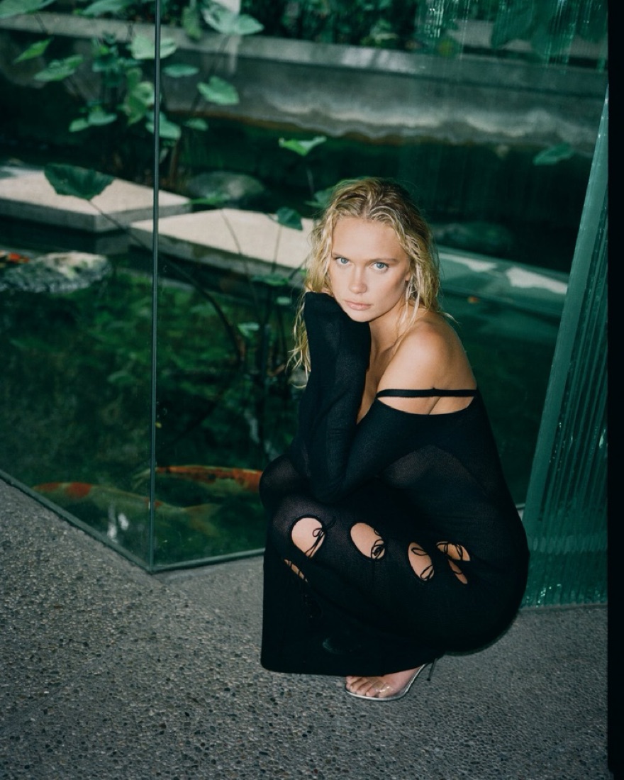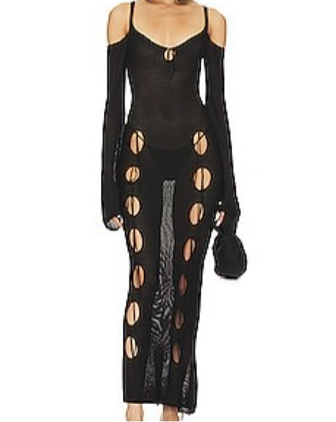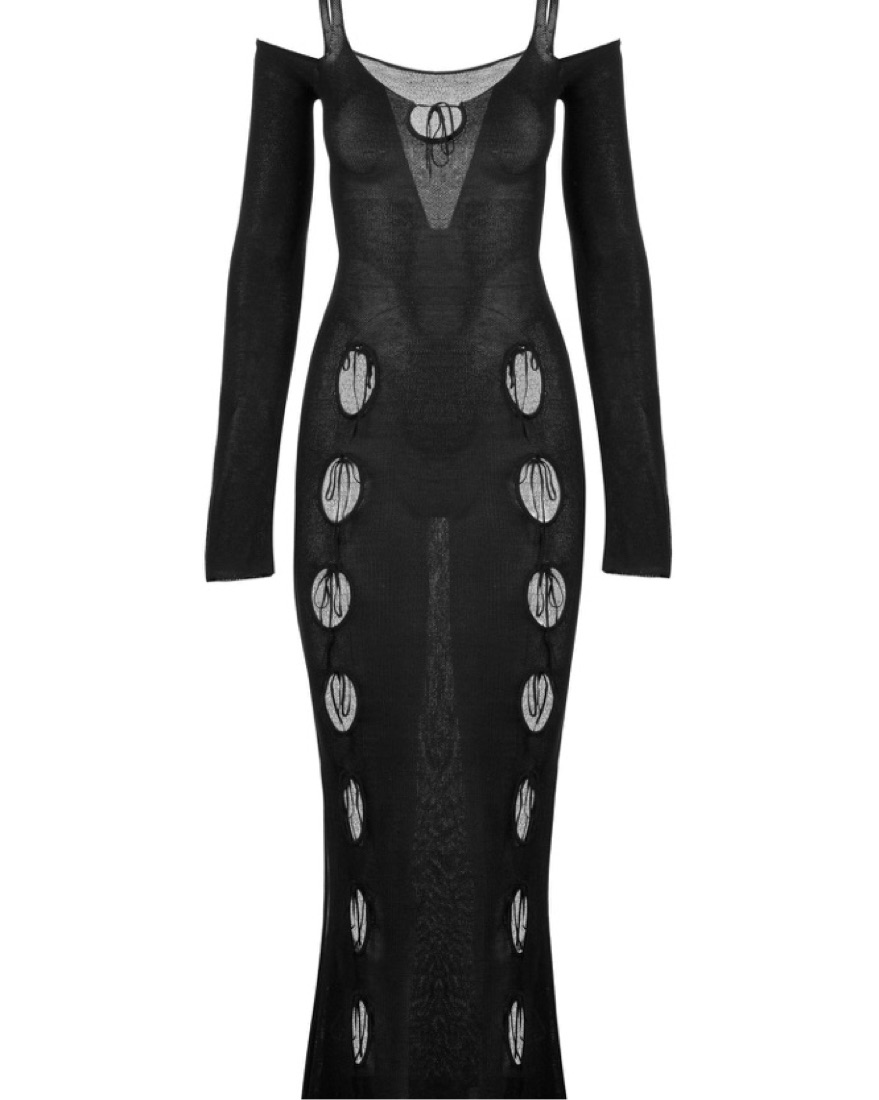 The Ysabel Dress in Black by ASTA RESORT. A floor length, long sleeve, semi-sheer dramatic dress designed to stand out in all seasons. Featuring keyhole cut outs from hip to toe with a tied sweet-heart neckline and exposed shoulders.