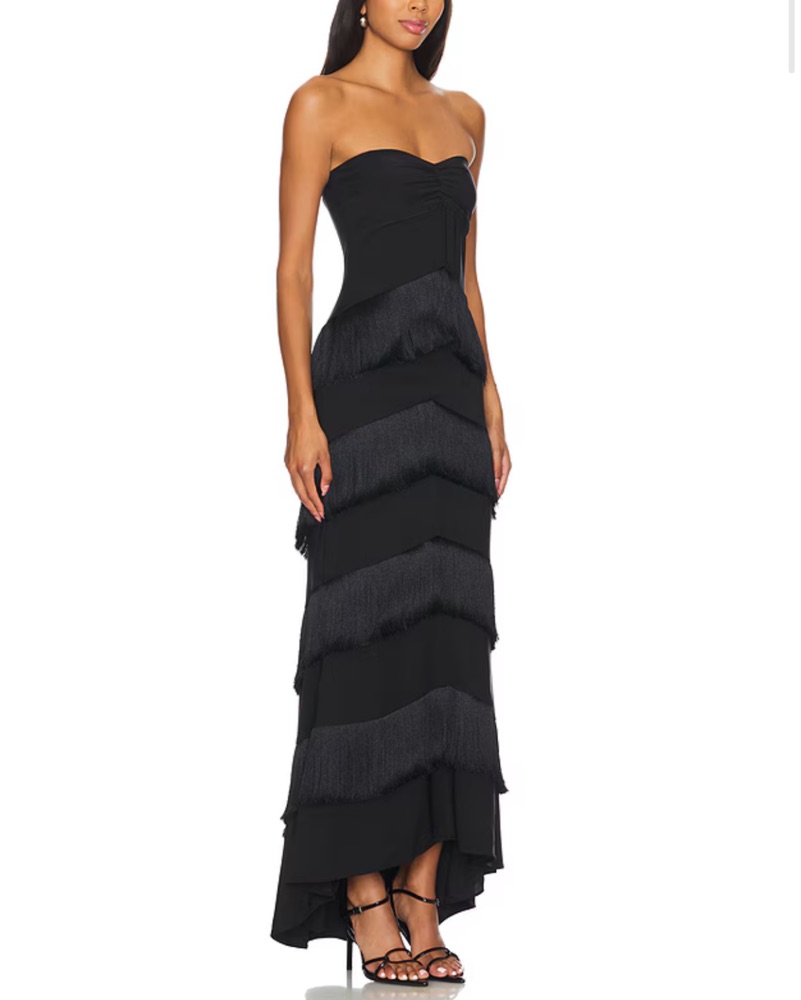 Hera Fringe Maxi Dress in Black - House of Harlow. This has been *slightly* altered in the bust to fit better and stay up. I am a 34C.