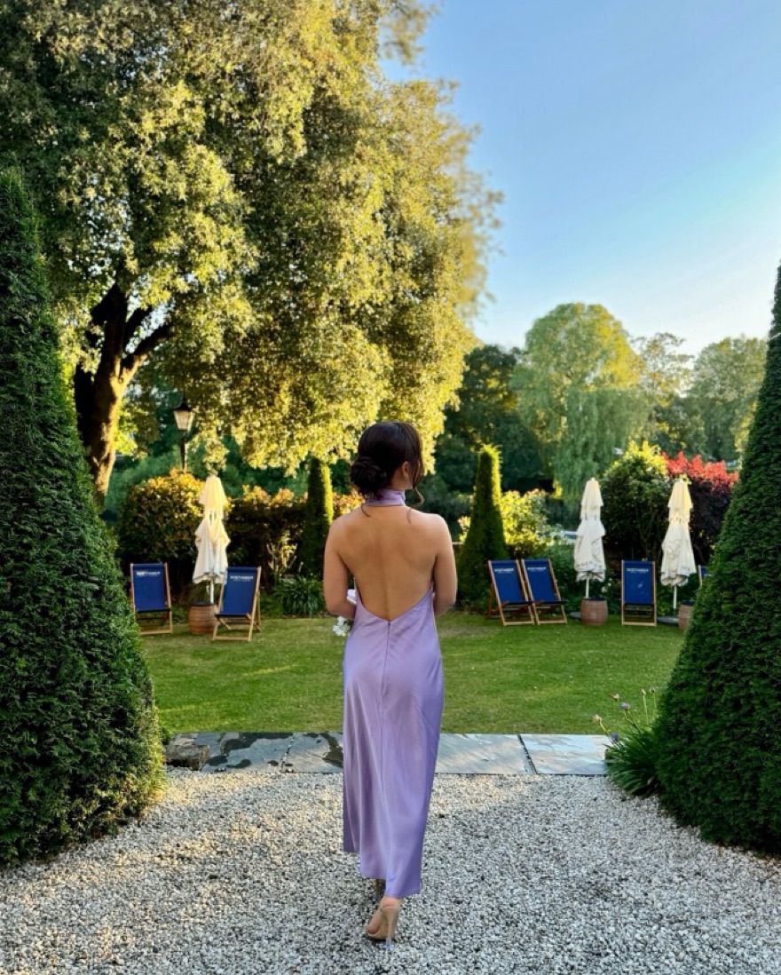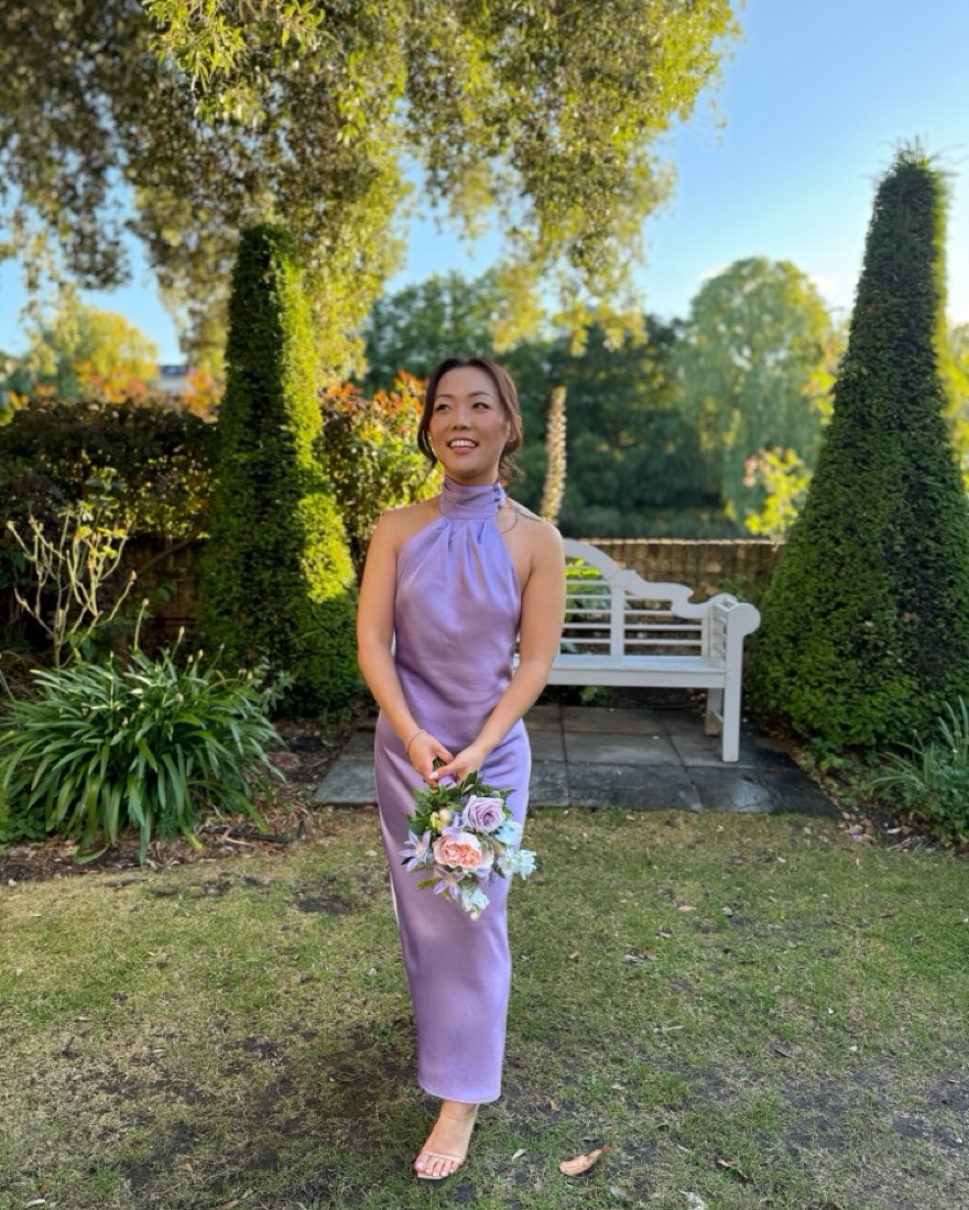 High-neck, lilac maxi dress for shorter individuals