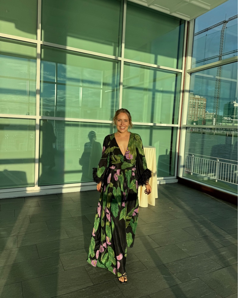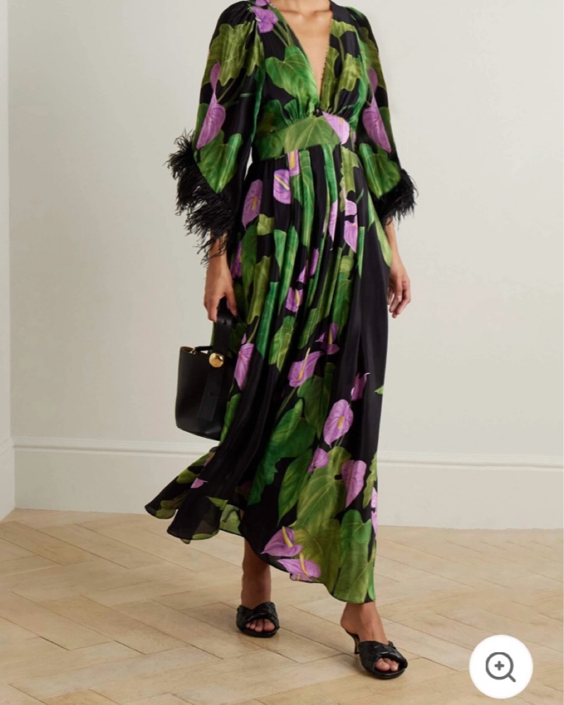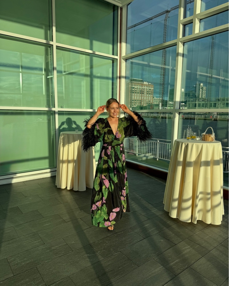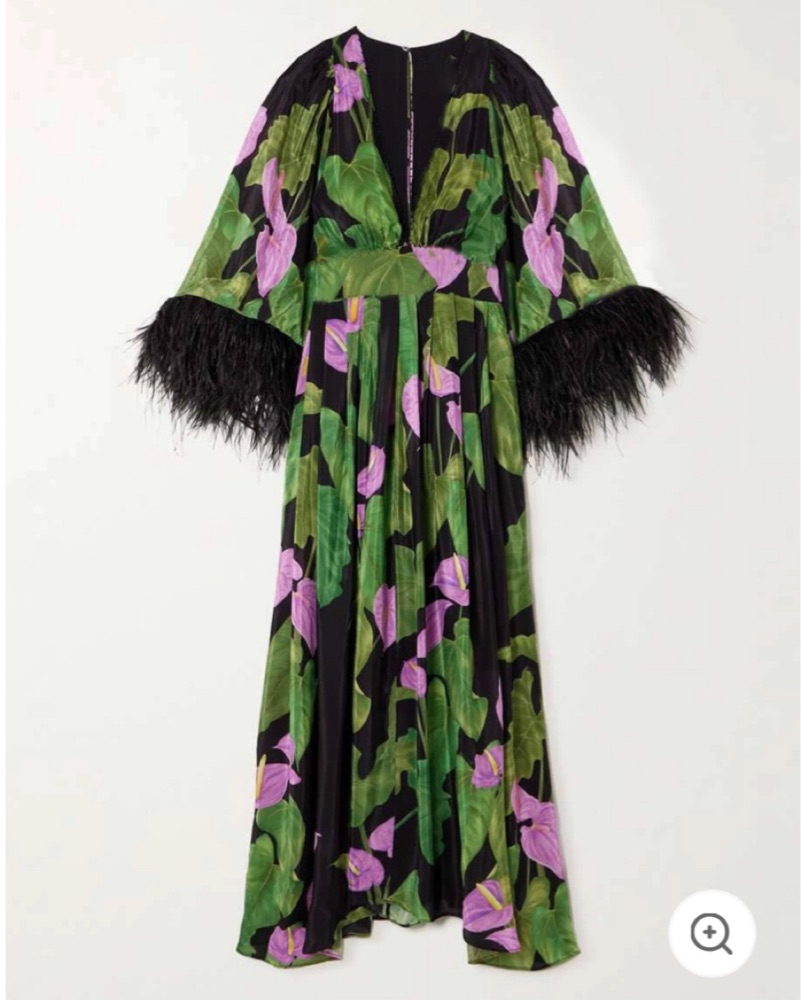 Farm Rio gown with feather sleeves. I wore it to a wedding and got tons of compliments. Super flattering and comfortable. Farm Rio no longer makes it his dress.
