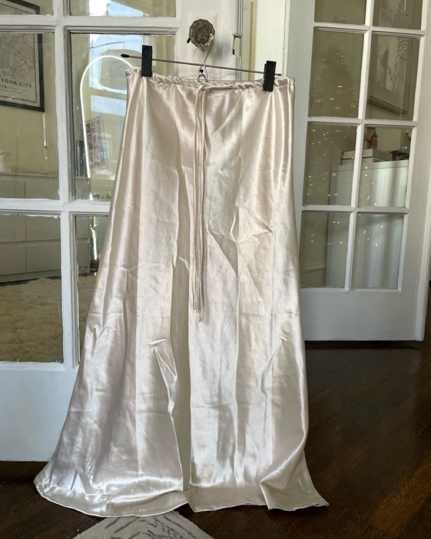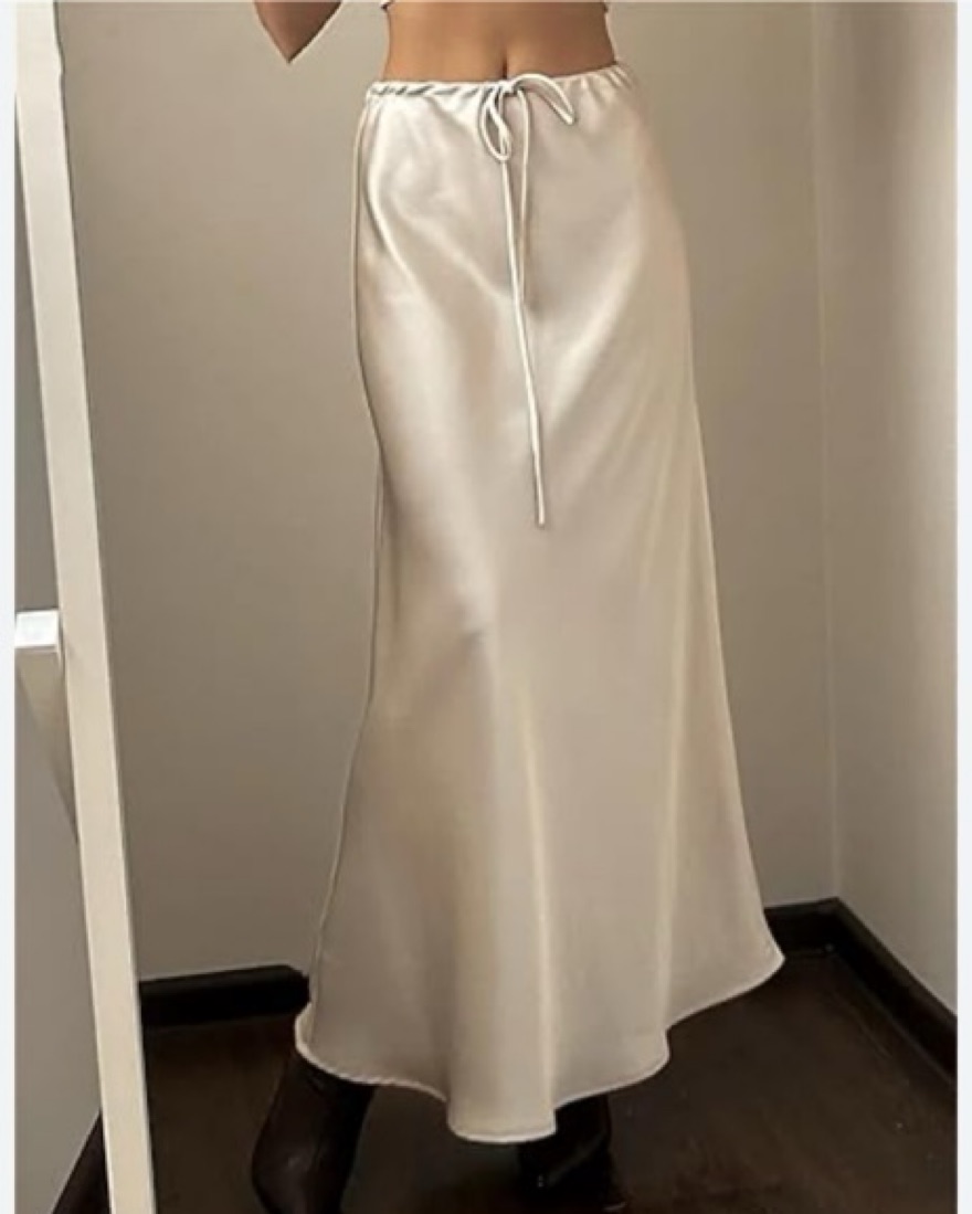 This luxurious satin maxi skirt exudes timeless sophistication. The flowing silhouette and drawstring waist create a flattering, feminine look.