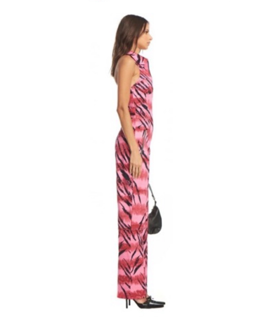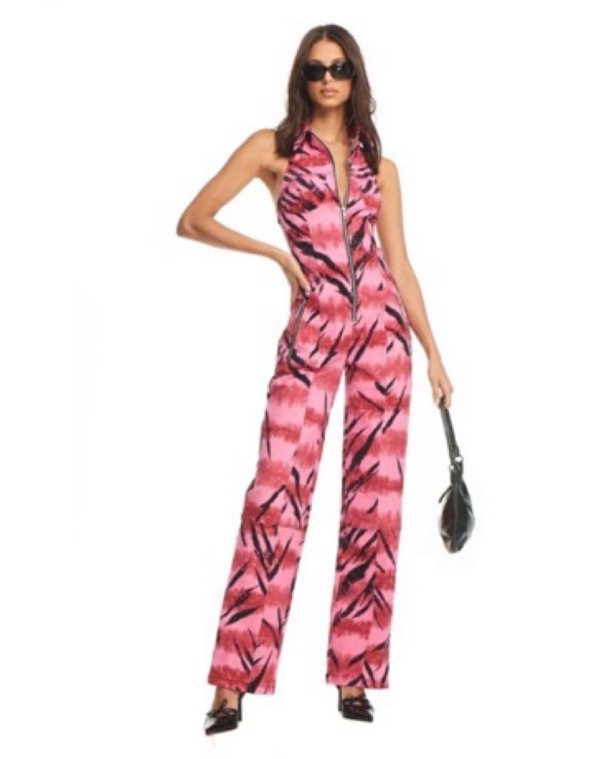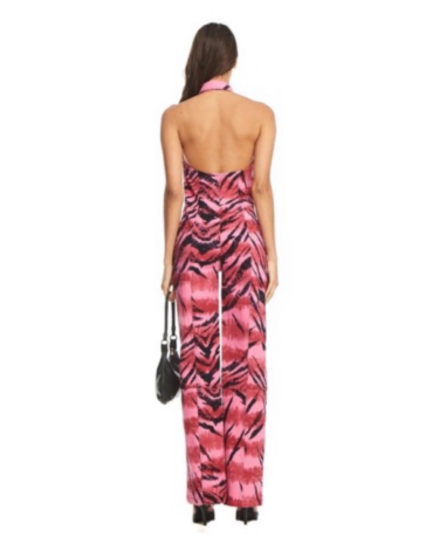 IAMGIA Genesis Tiger tie-dye full length jumpsuit XS fits a S Halter neck with zip up and collar Backless design with wide leg pant Original GIA print tiger tie dye with black contrast stitching Workable silver centre-front and hip pocket zips