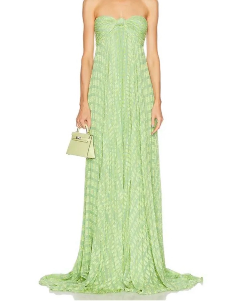 This stunning mint chiffon gown is perfect for a formal event. The pleated detailing and flowing silhouette create a graceful, feminine look. Note: I’m 5’8 and it’s not floor length on me (probs three inches above my feet)
