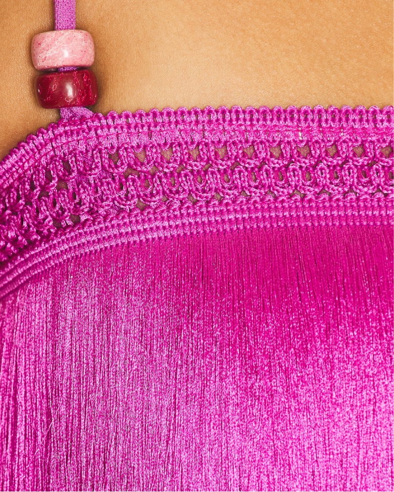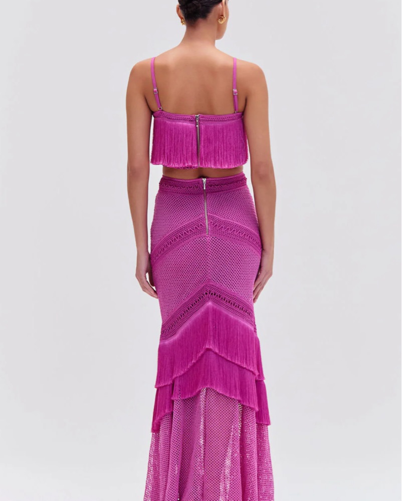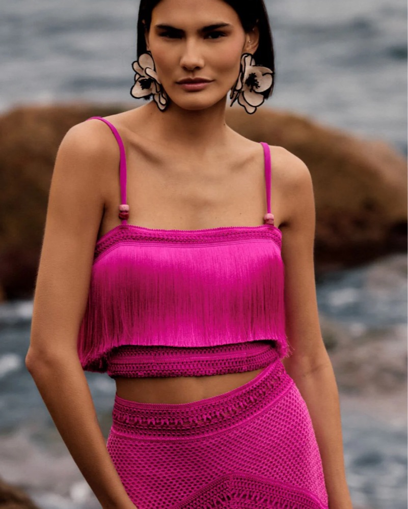 Patbo Sleeveless Fringe Cropped Top in Cerise. Fits a size 4 or 6 (34DD). Please be mindful not to zip and slice the fringe as you put it on.