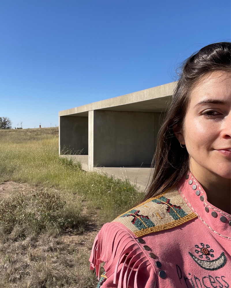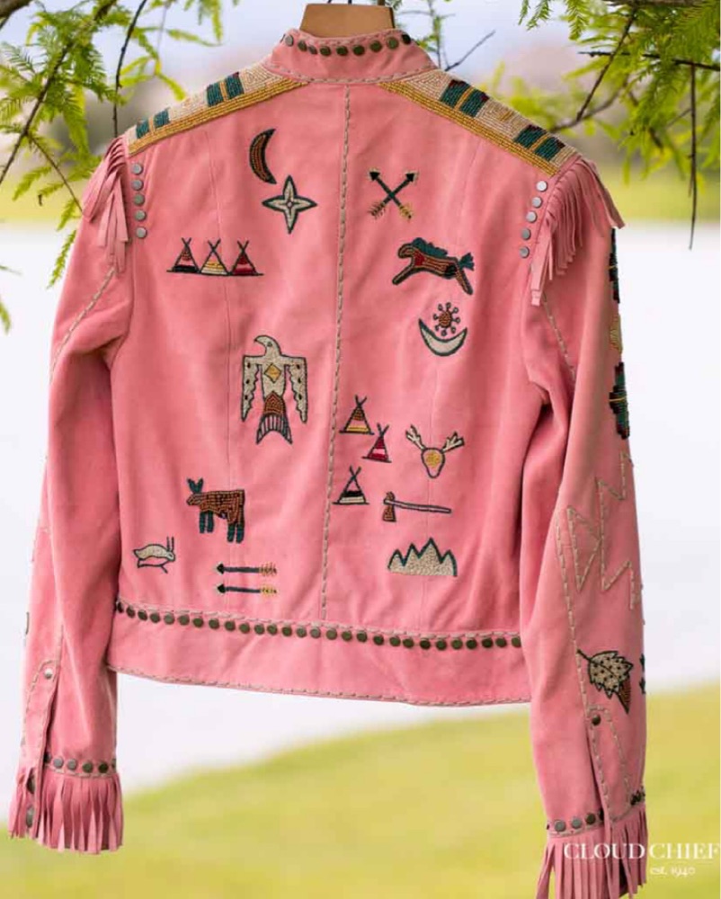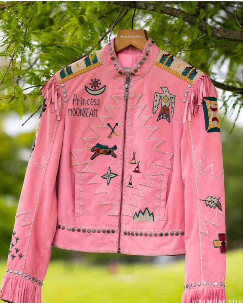 Princess moonbeam jacket in pink suede with fringe and beading motifs throughout. Worn once in Marfa