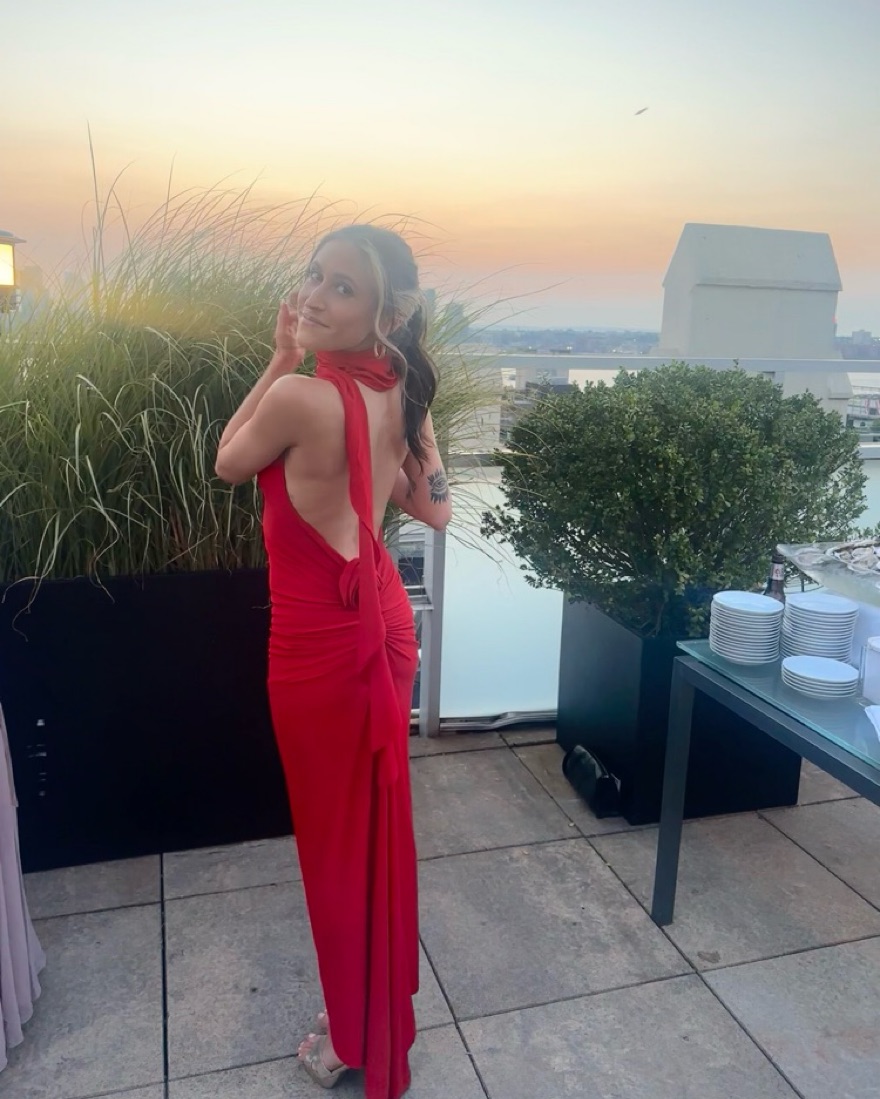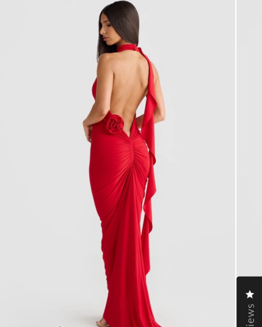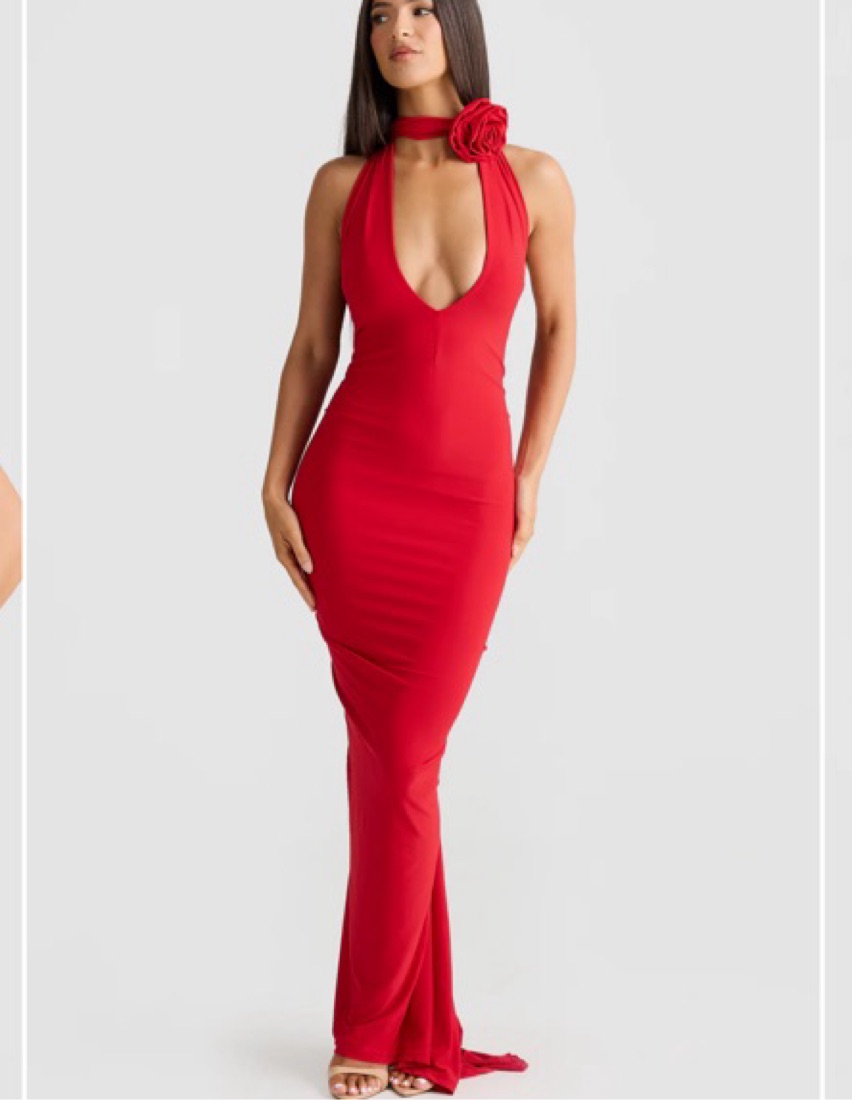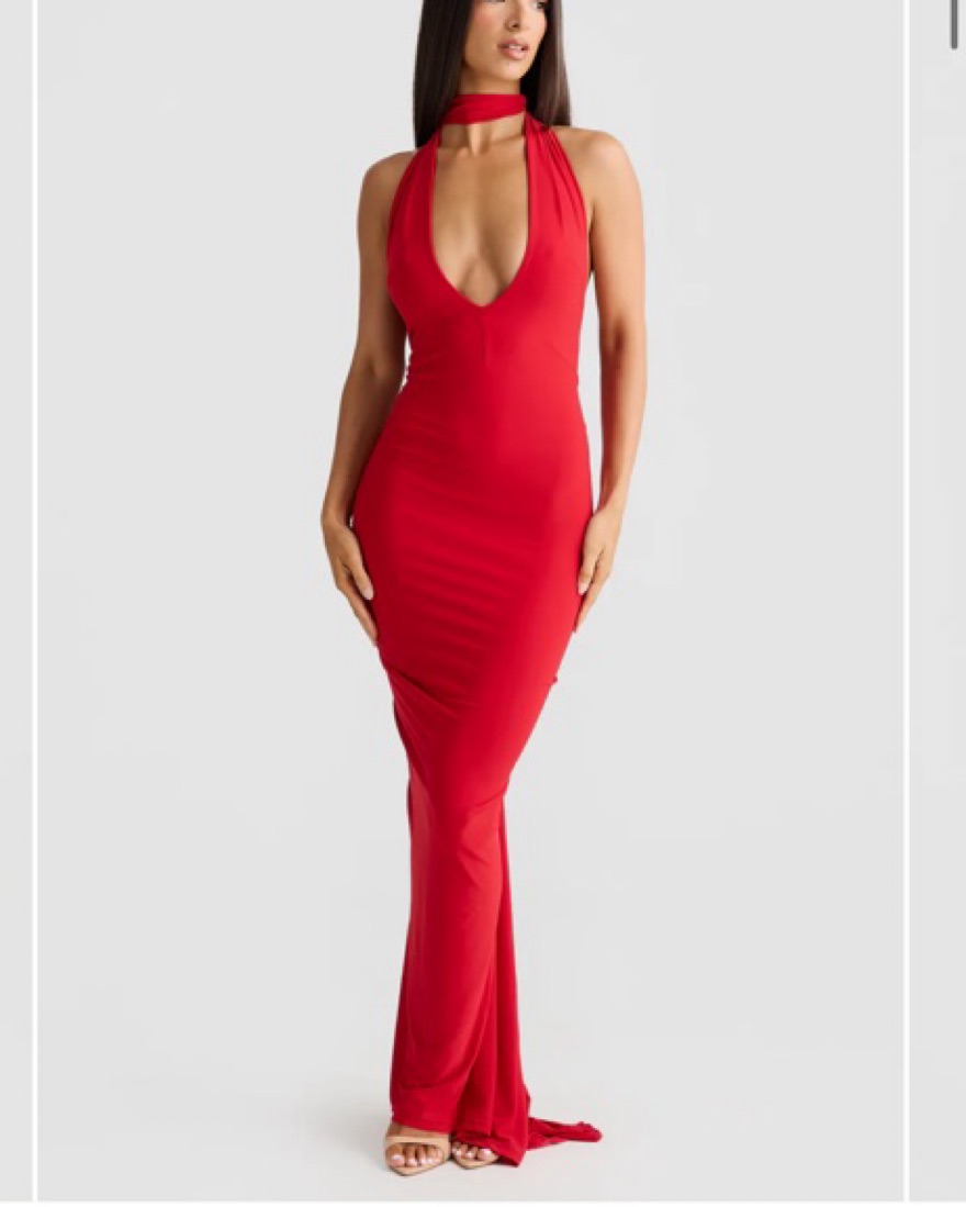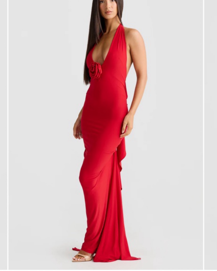 Arabella dress by Melani The Label. Super flattering and gorgeous in a classic red. Scarf / necktie is attached and can be wrapped around in different ways. It includes a detachable rose in the same color and material that can be attached to different areas of the dress. It is so flattering!