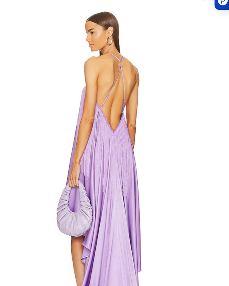 REVOLVE X Michael Costello This stunning halter dress in a beautiful lavender hue is perfect for a formal event or special occasion. The draped, high-low silhouette and intricate beading create an elegant, eye-catching look.