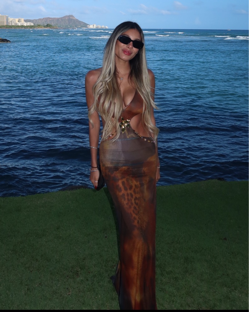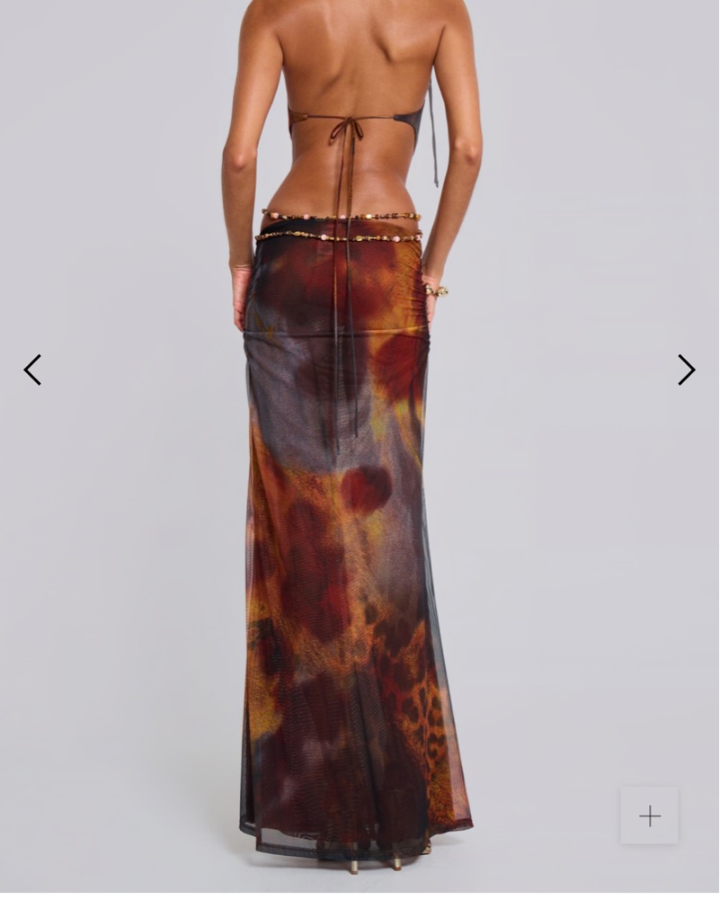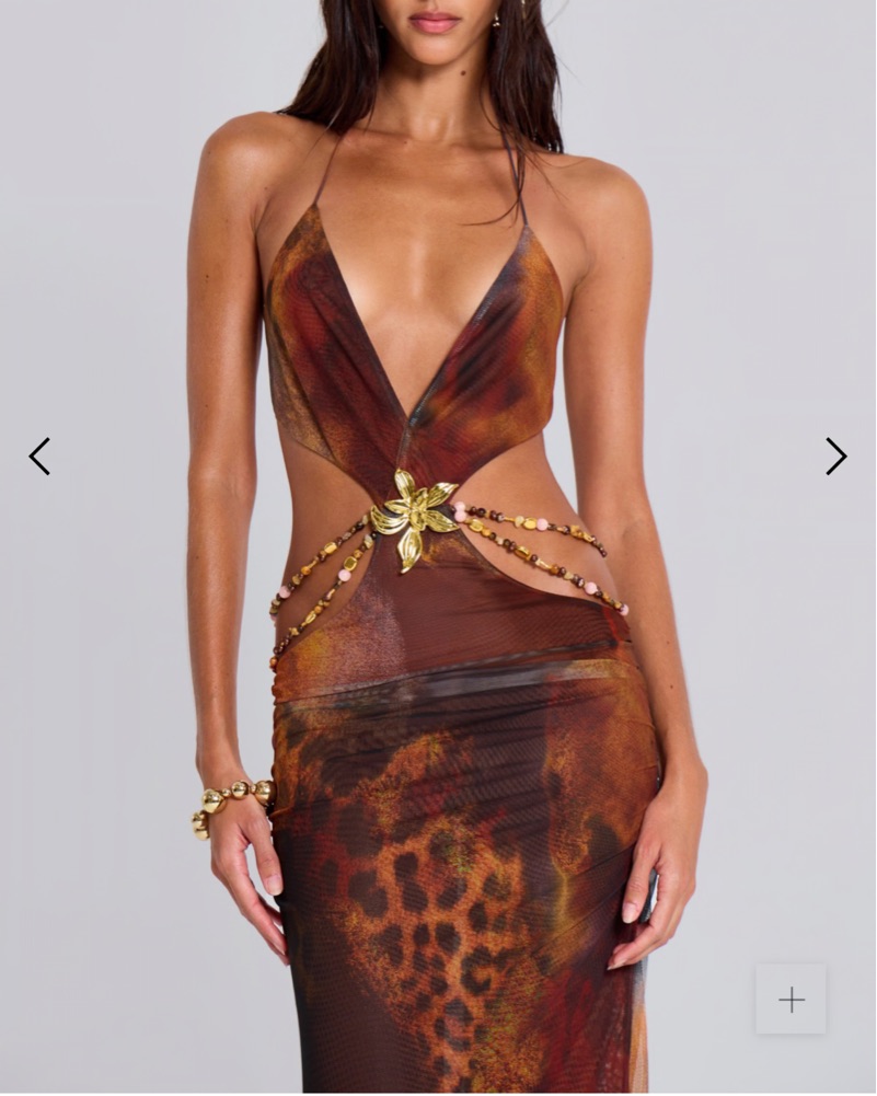 Printed plunge maxi dress with a gold 3D flower and beaded hip chains