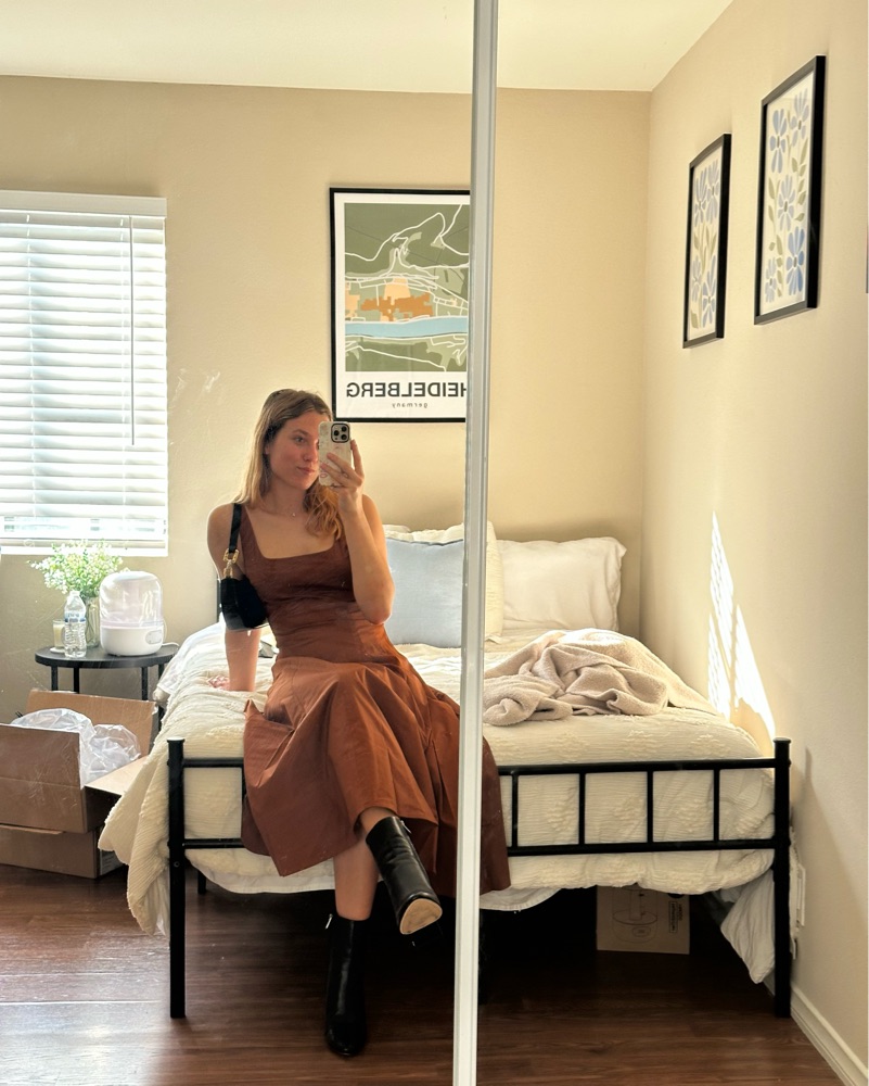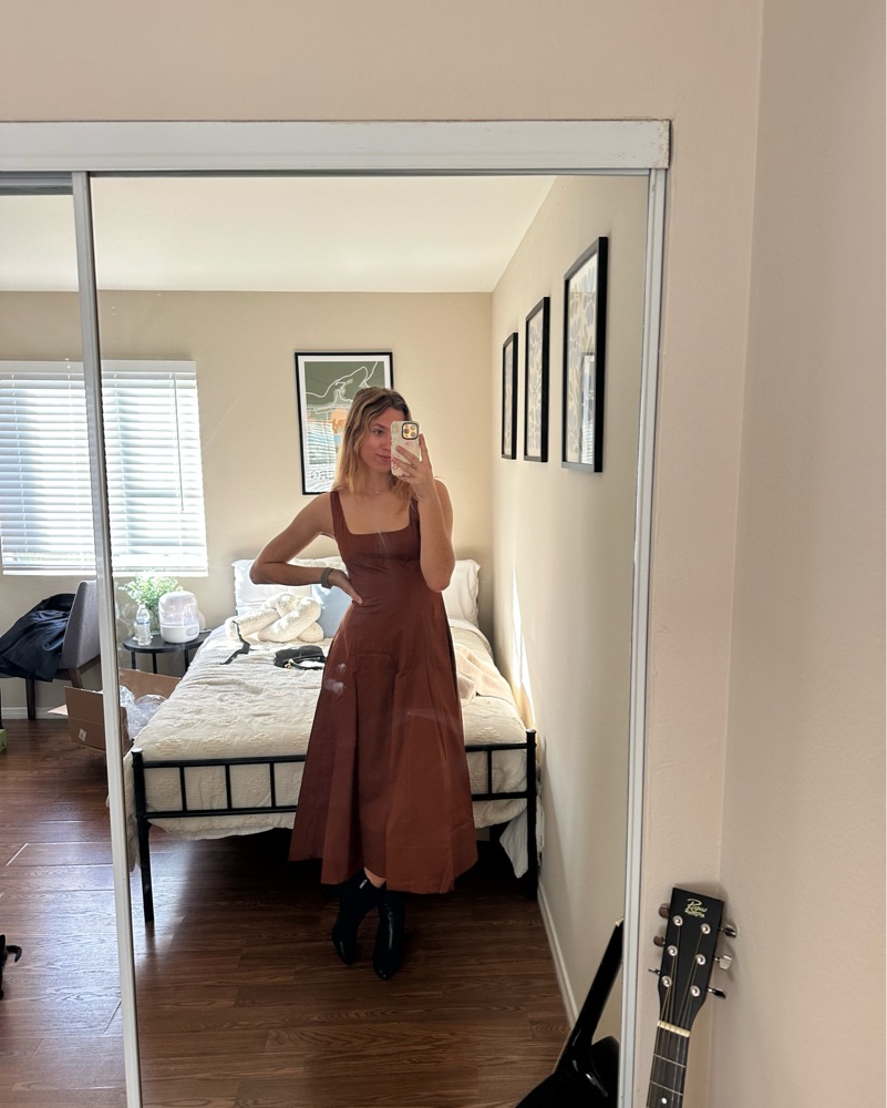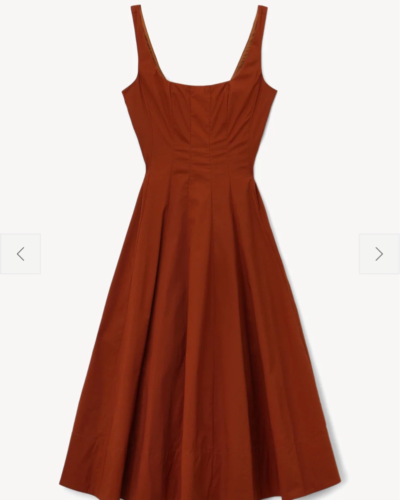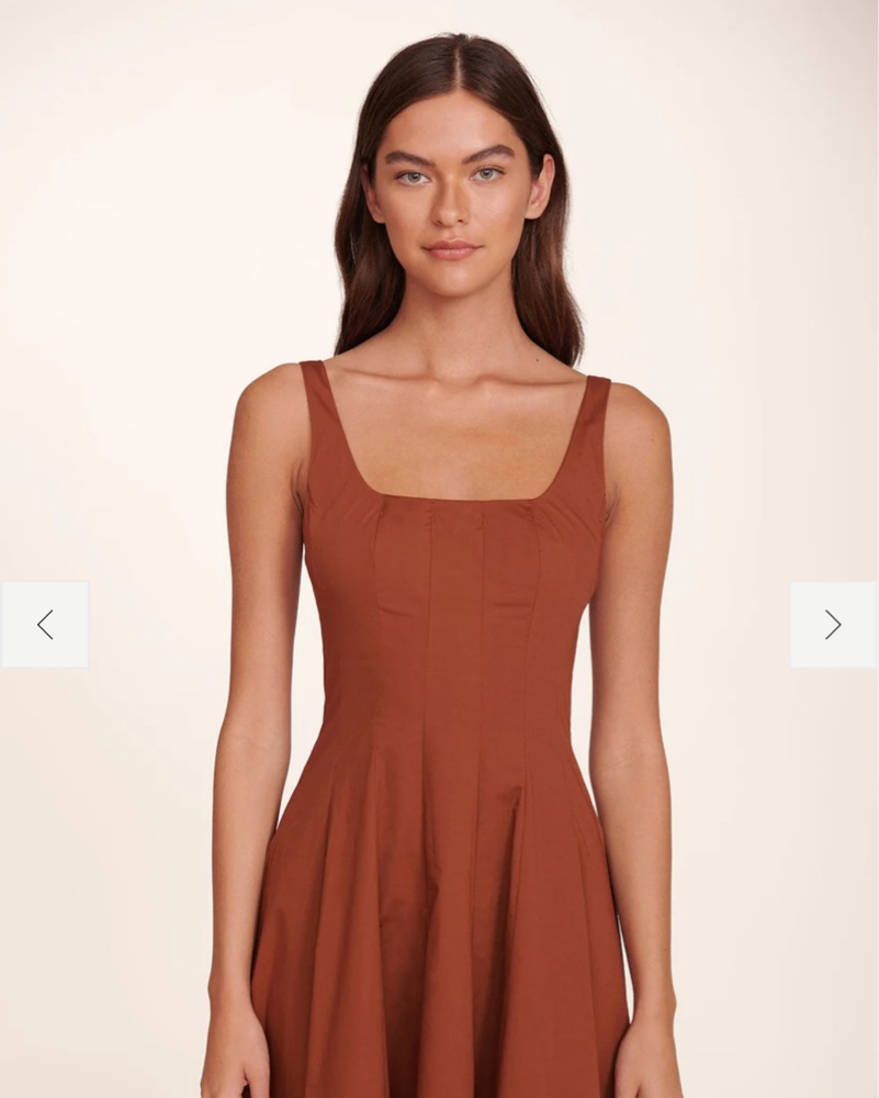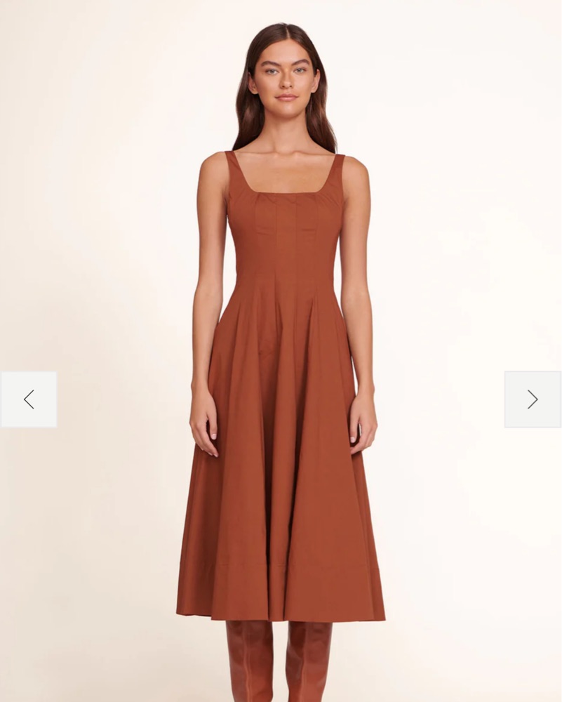 This rust-colored Wells midi dress from Staud is a versatile and stylish option for any occasion. Pair it with heels and statement jewelry for a chic night out, or dress it down with flats and a denim jacket for a casual daytime look. Can fit a size 4 or 6