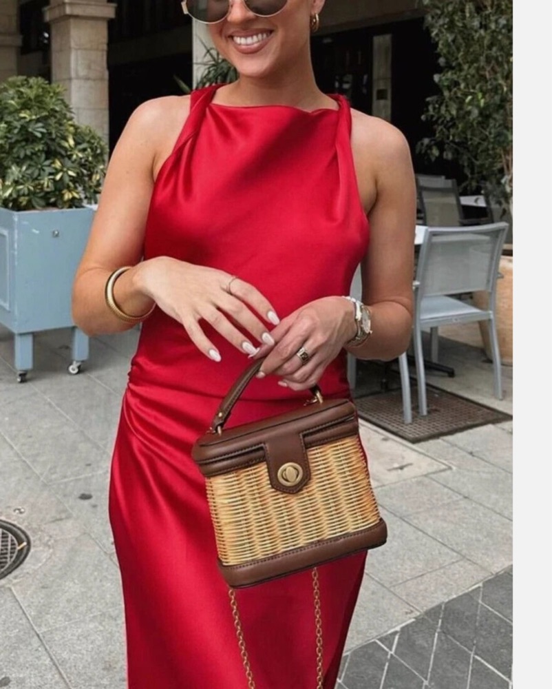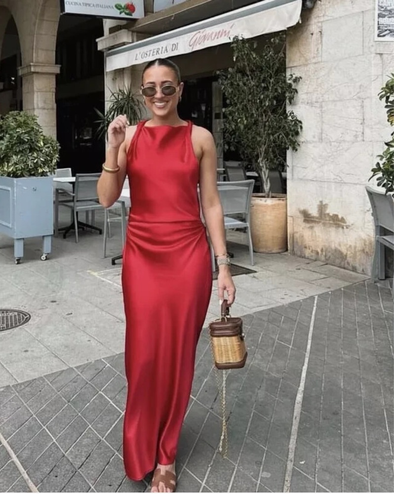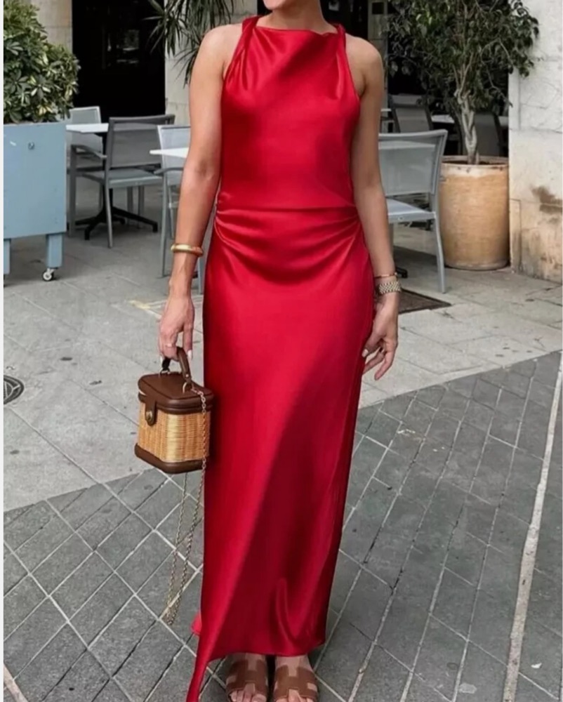 This sleek and sophisticated maxi dress in a vibrant red satin is perfect for an elegant evening out. It's a stunning choice for formal events or special occasions.