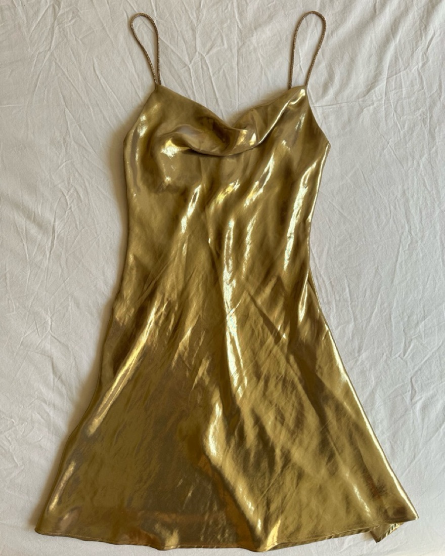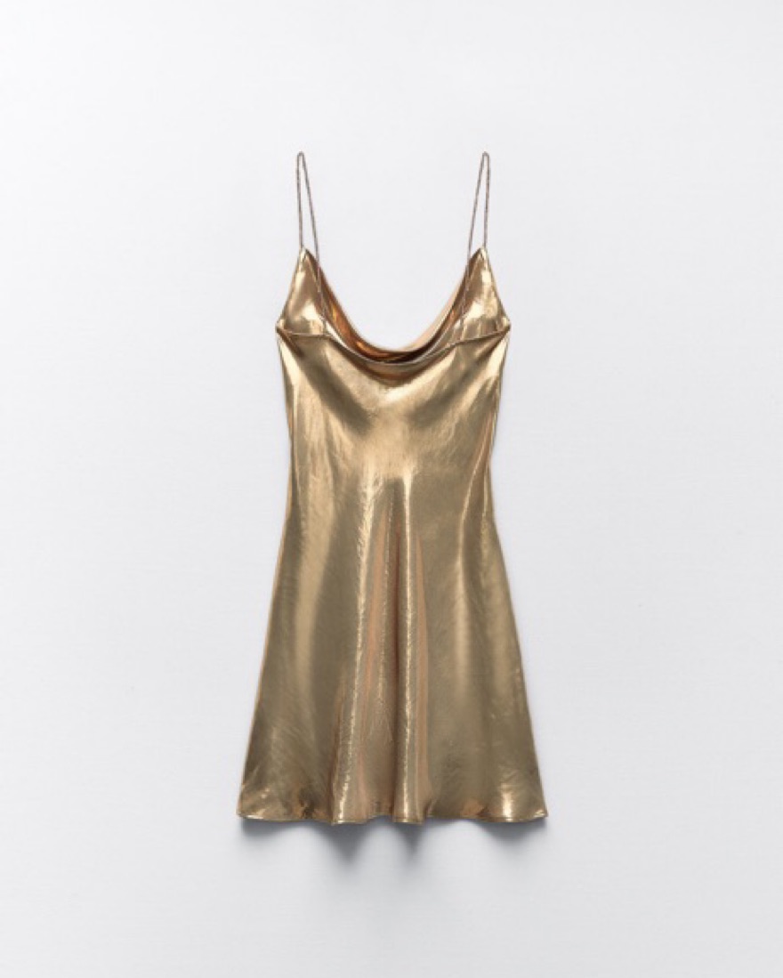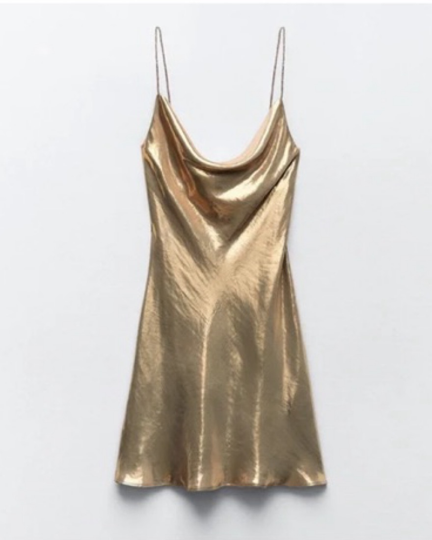 Zara gold metallic rhinestone strappy mini dress, size XS. Satin material with rhinestone straps. Cowl neck. Worn only once!