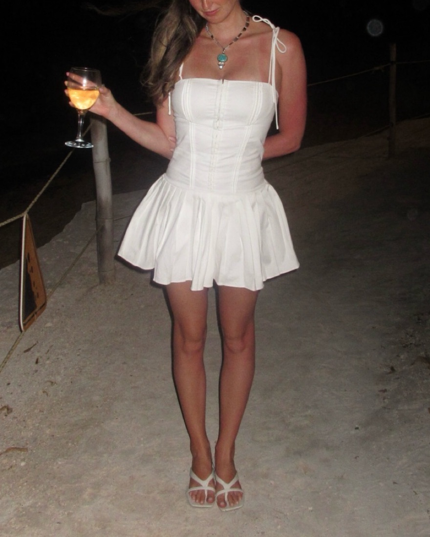 Corset top and pleated bottom with bow tie straps. Super cute and fun!