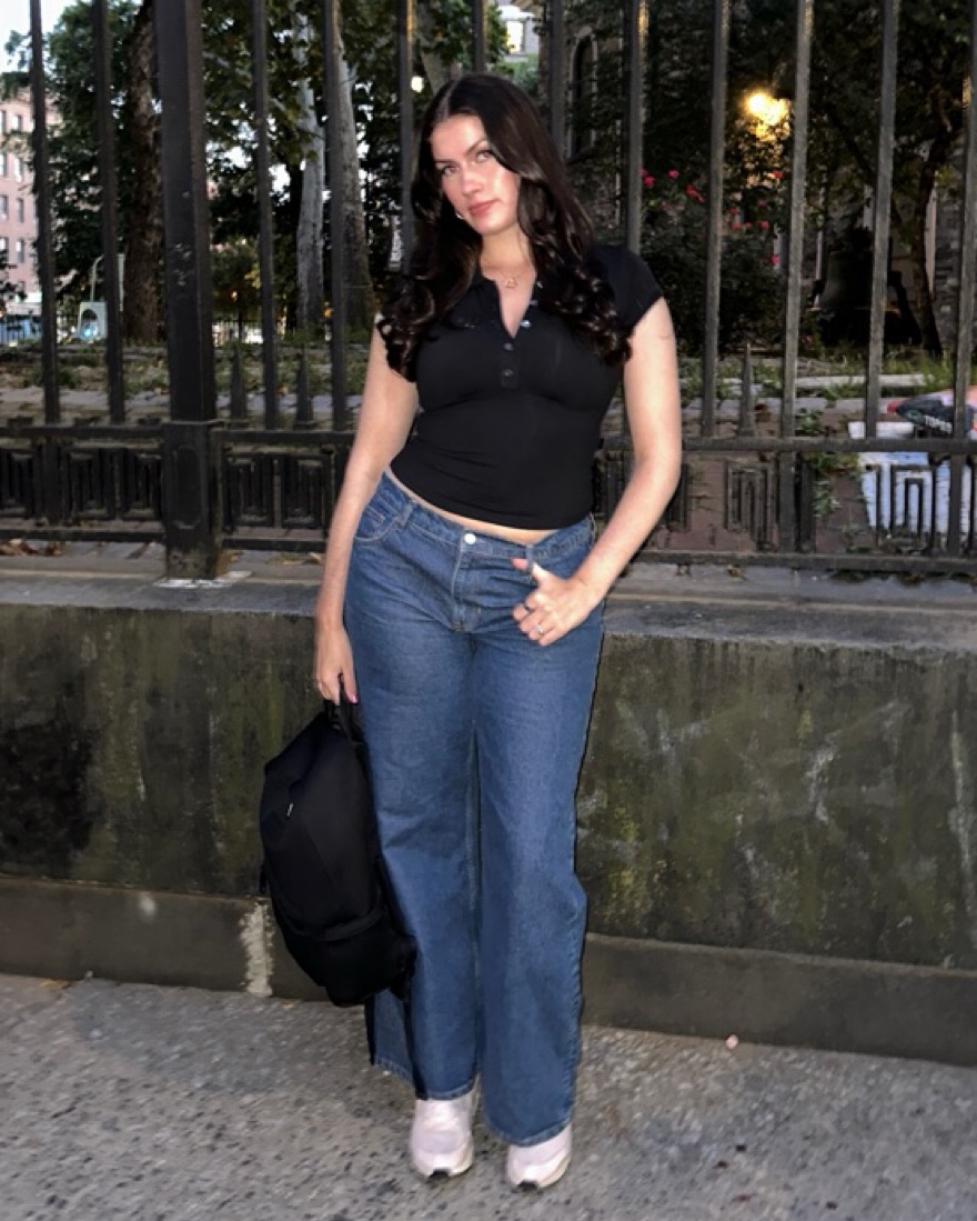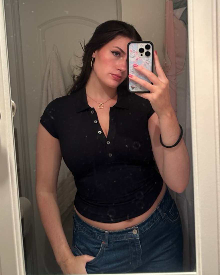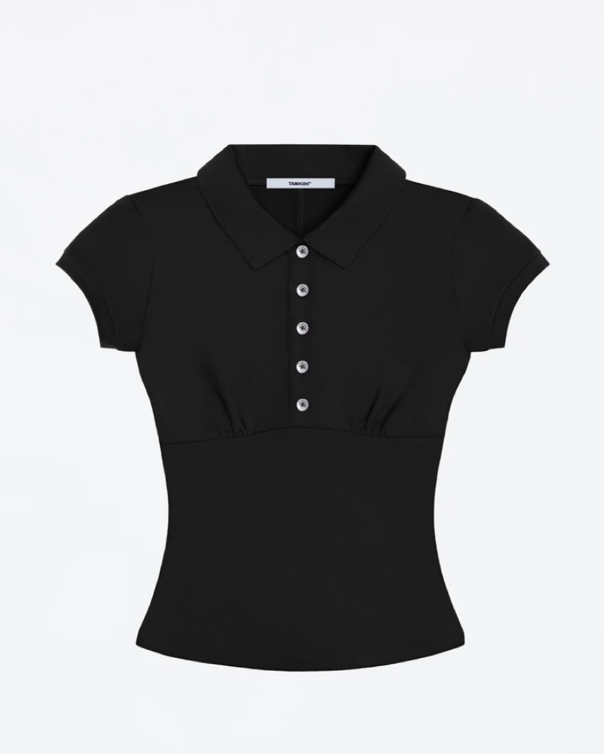 Cap sleeve polo baby tee detailed with pearl buttons. The Polo Baby Tee is cut from our signature heavy-weight, sueded stretch jersey. It has a soft feel, strong hold, and a matte finish. Intended for a very close fit