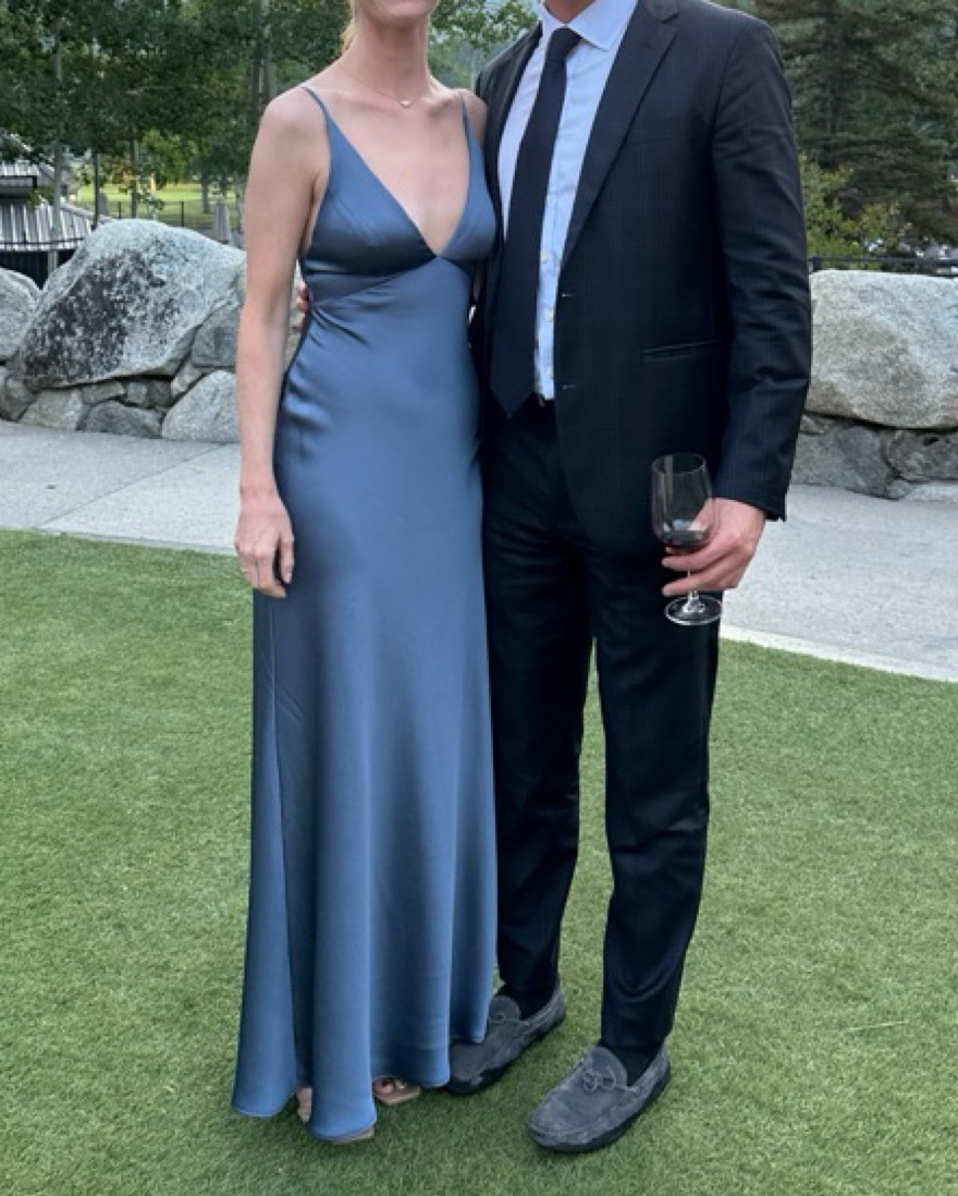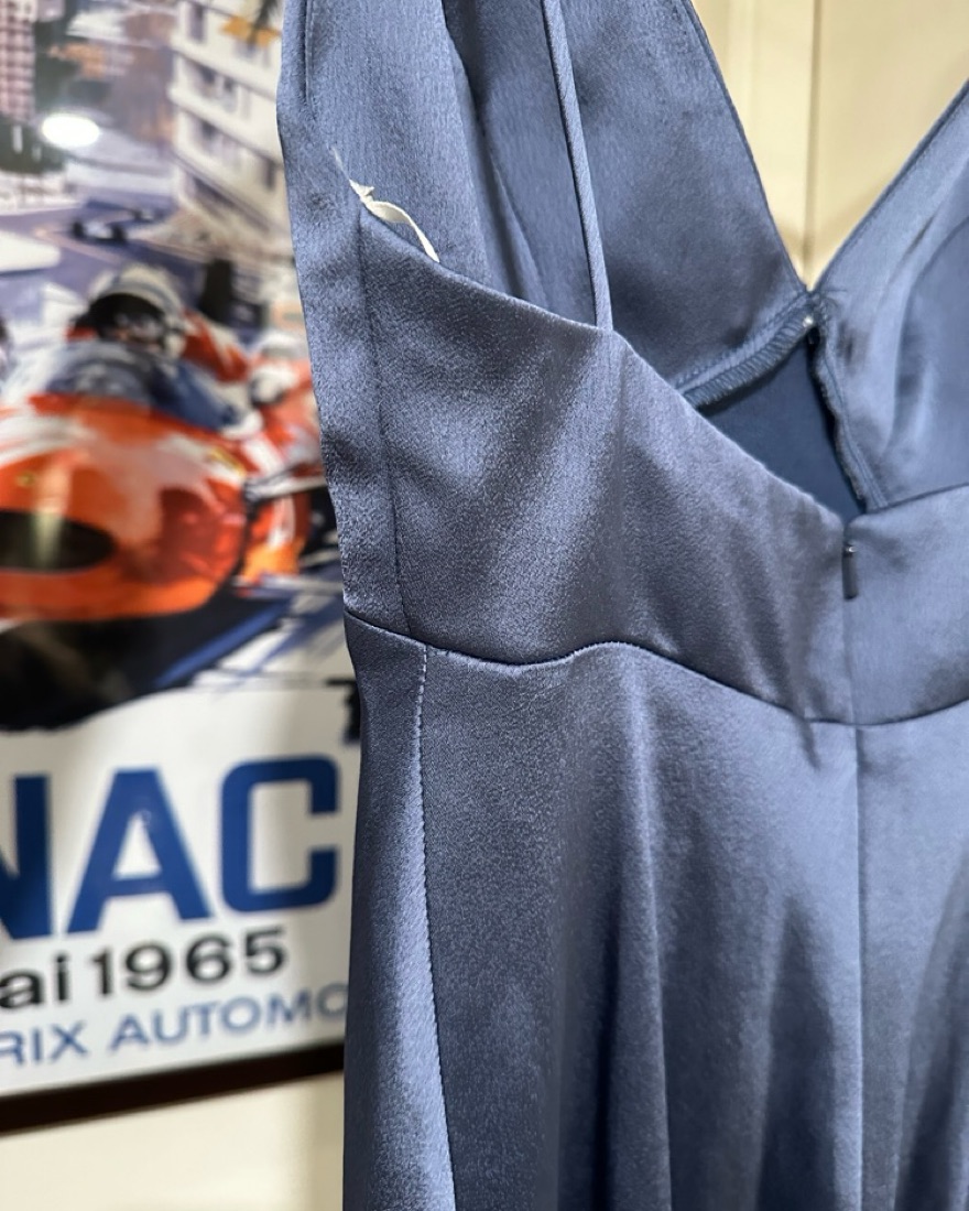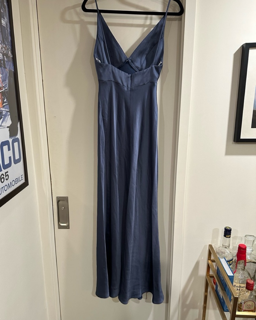 Worn once - hemmed for someone 5’6” in 3-4 inch heels. And waist tapered to fit 26”. Color is evening blue and fabric is luxe satin