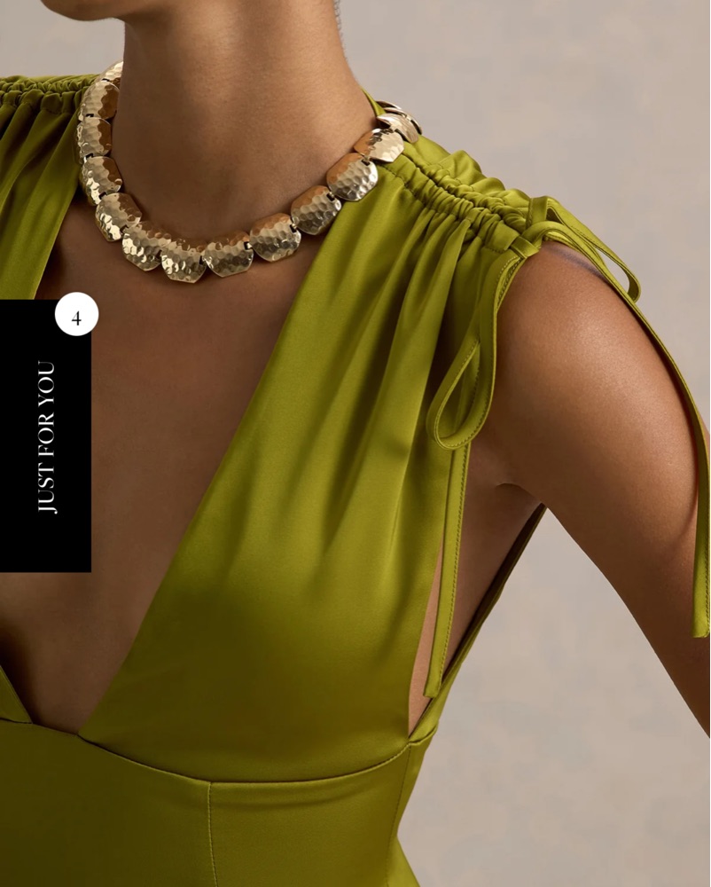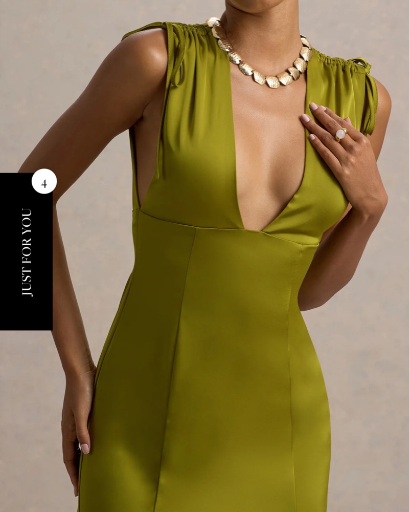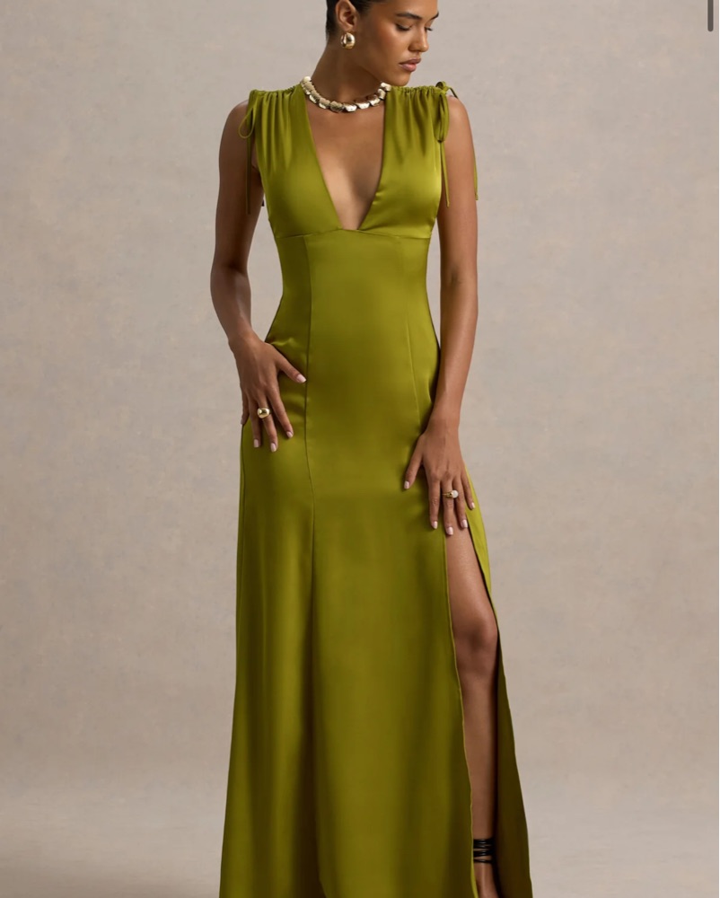 OLIVE SATIN PLUNGE-NECK SPLIT MAXI DRESS by Club L London - Pickle