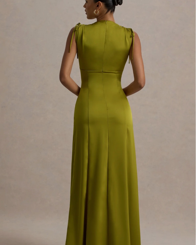 OLIVE SATIN PLUNGE-NECK SPLIT MAXI DRESS