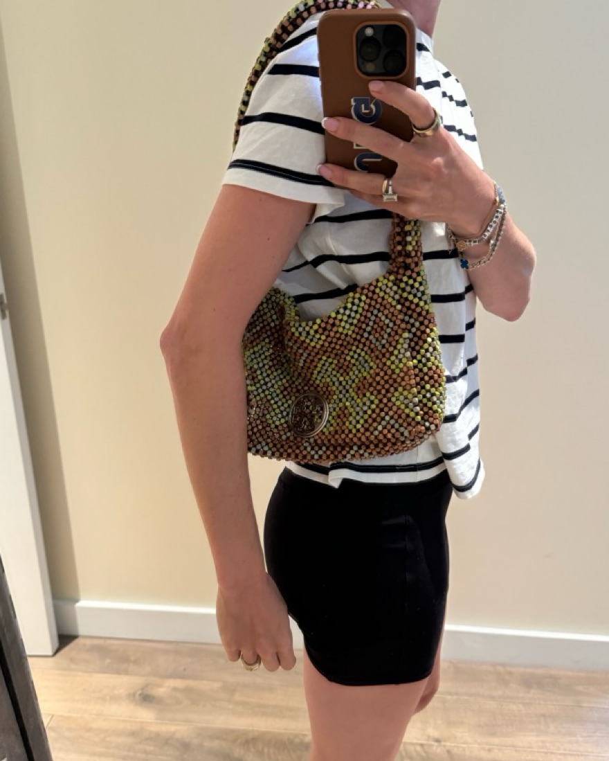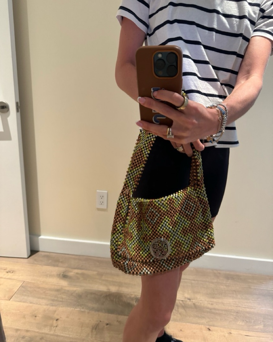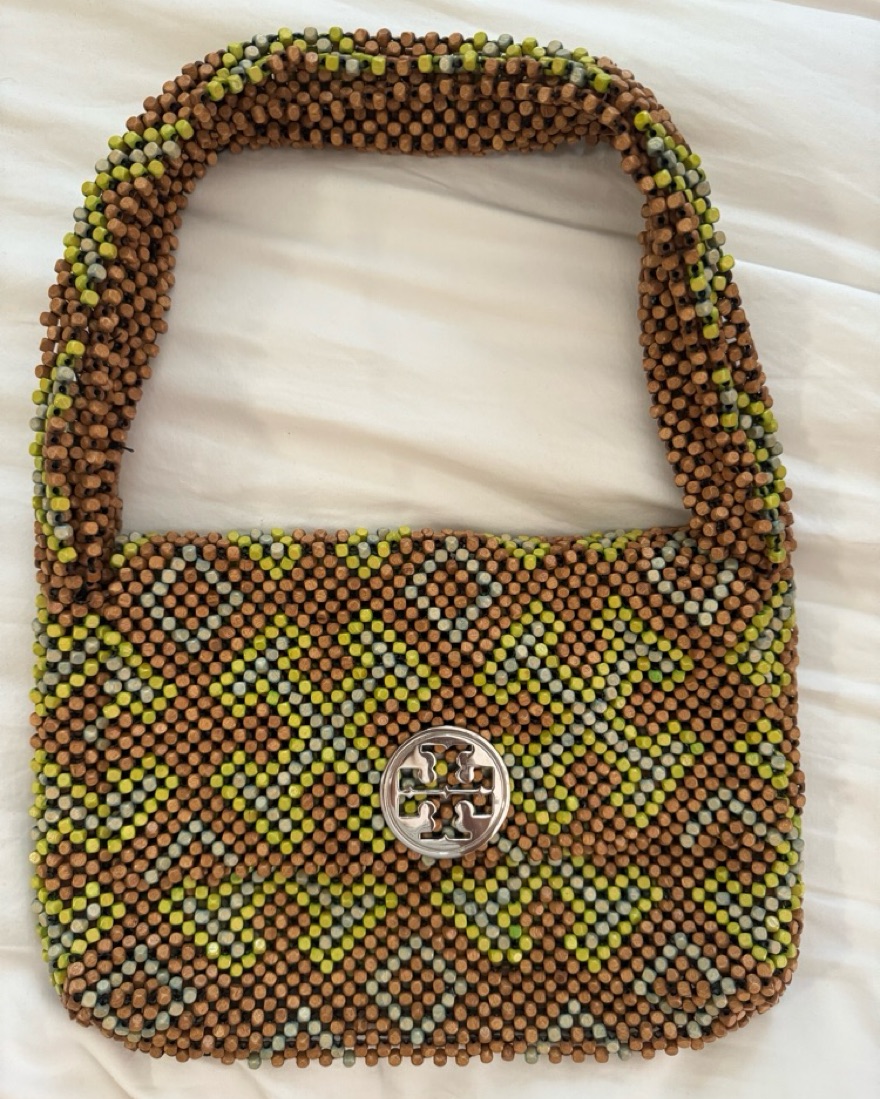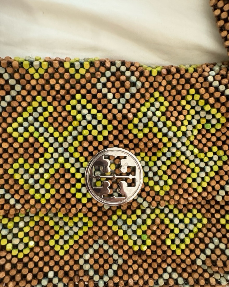 Tory burch beaded bag. Green and brown, such a fun bag for the summer! Silver logo.