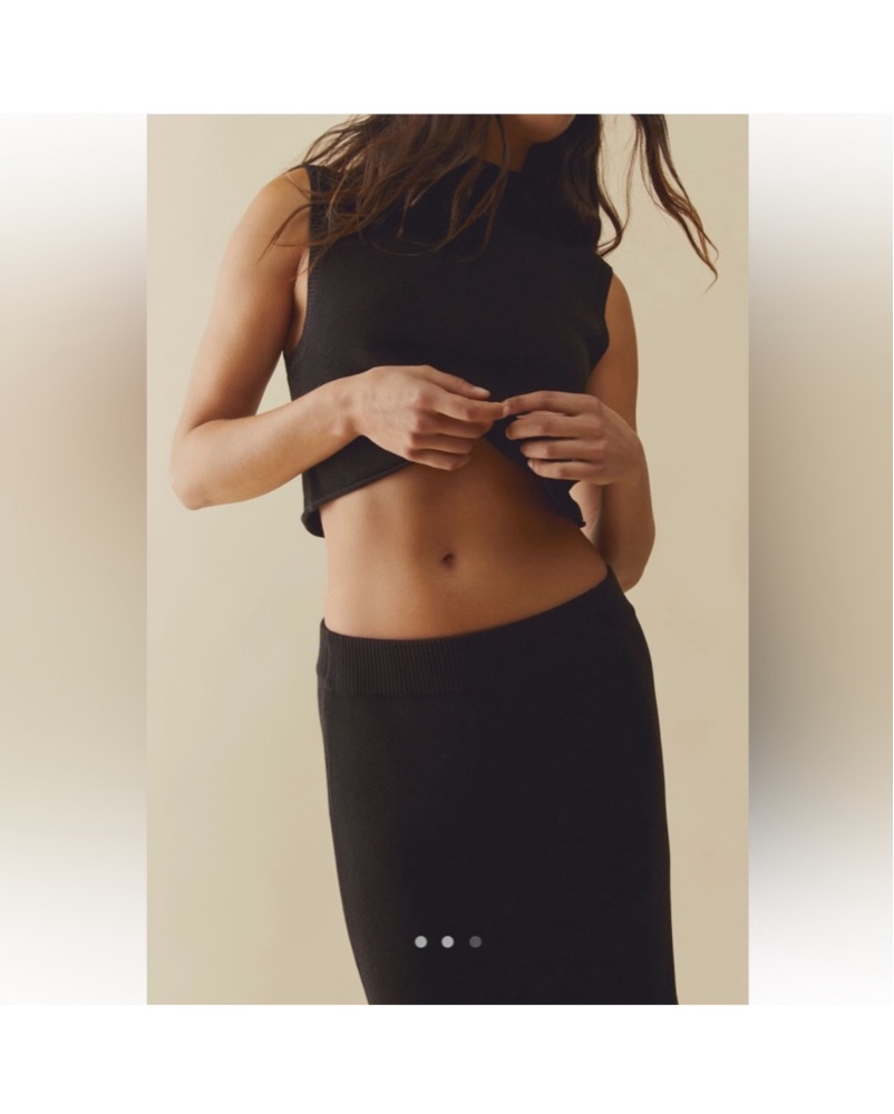 Ribbed trimming, skirt fits midi style not maxi and I am 5’. Super comfortable!