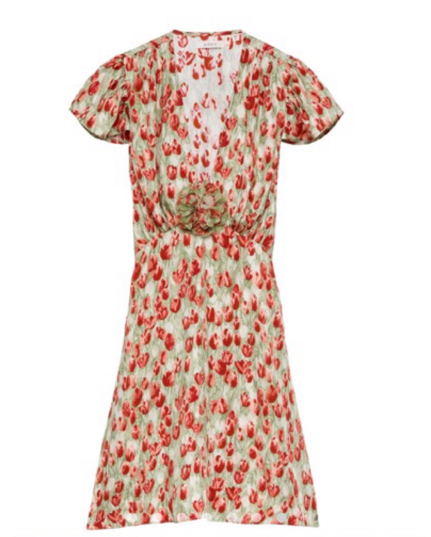 Doen Kelsea dress in Tulip Fields print! Size XS, with a flattering V neckline, removable rosette brooch and tie back.