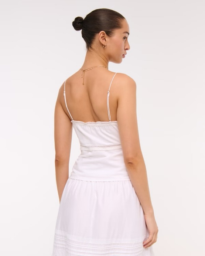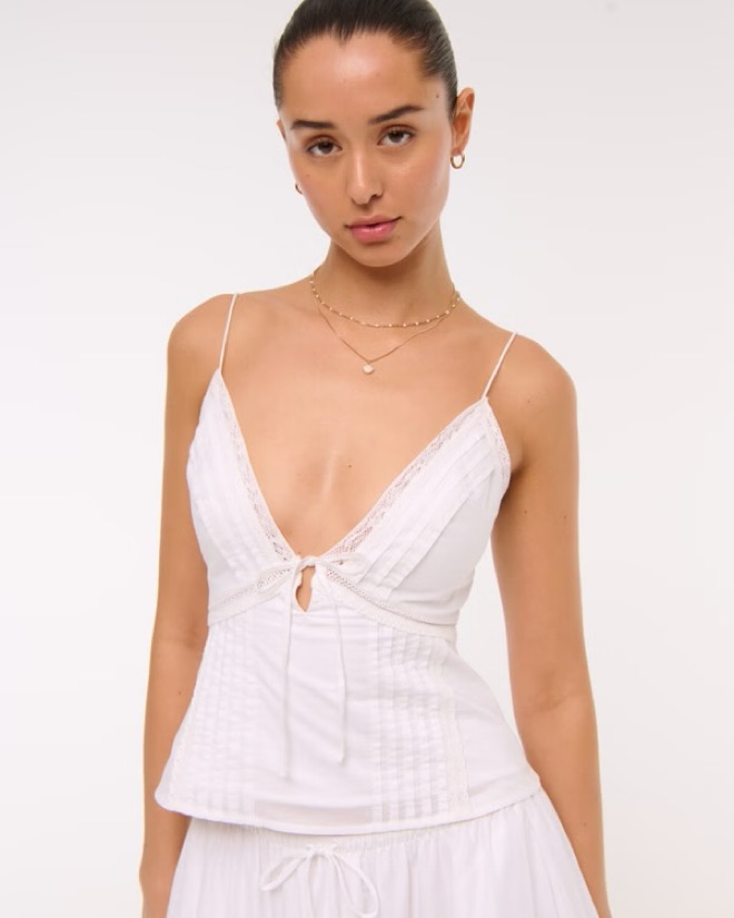 A&F Bella Tie-Front Cami in white from Abercrombie. Has adjustable straps and can be styled easily! Size XXS but can fit a XS tbh
