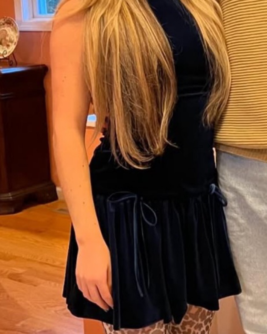 Blue velvet fit and flare dress. Super flattering, not too short, love the shape! Xs