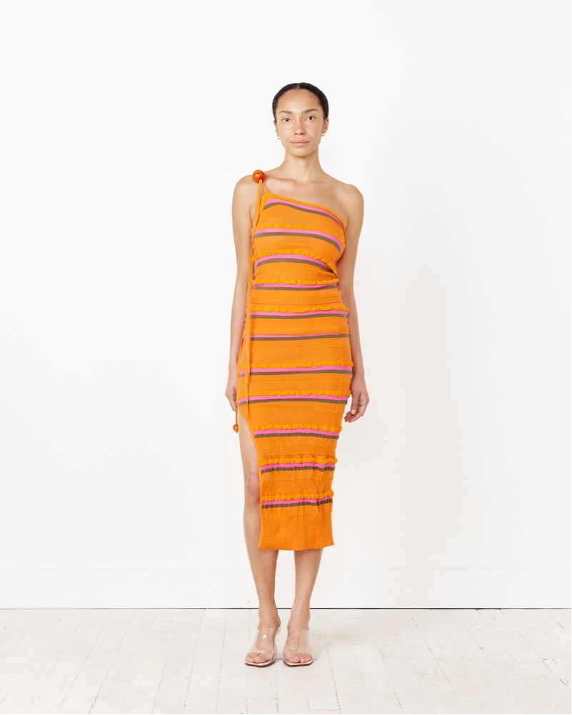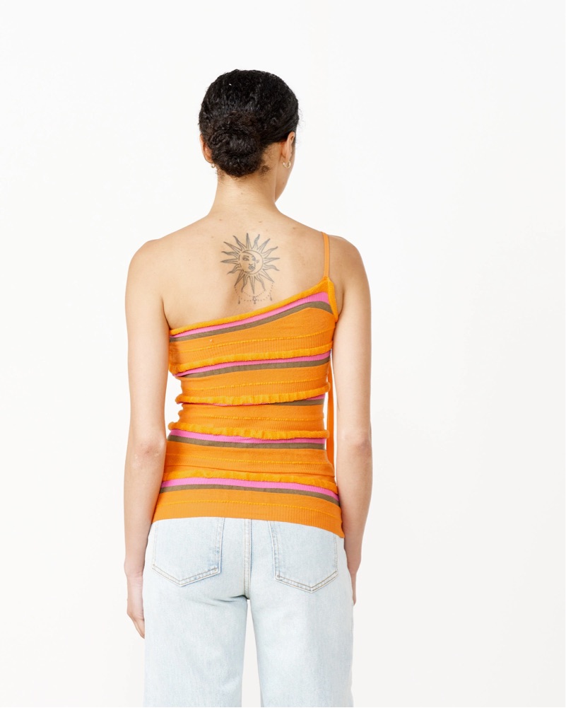 JACQUEMUS - La Maille Concha Knit ribbed Striped Top Orange and pink texture with ball detailing adjustable straps one shoulder or neck scarf / strap style size 38 but fits anywhere from XS to M