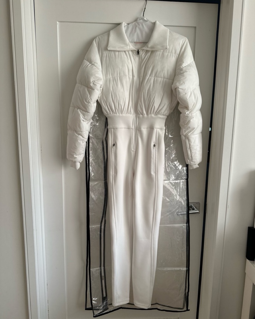 A warm, waterproof ski suit with a puffer top & fitted bottom, featuring an ultra-high elastic waistband & ribbed collar. Arguably warmer and more functional than any $1,000+ suit in my closet on and off Pickle.