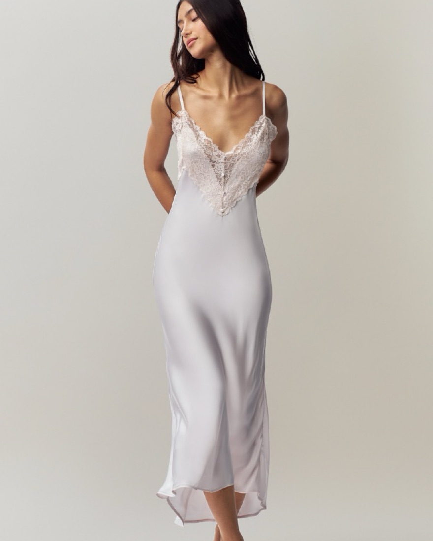 As seen on Isabelle Mathers. A silky lace slip midi dress with adjustable straps. Actually a very blush almost pale pink - white color