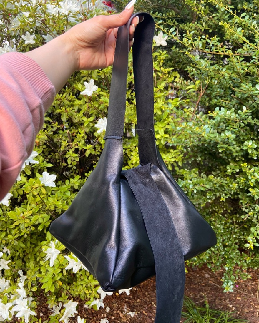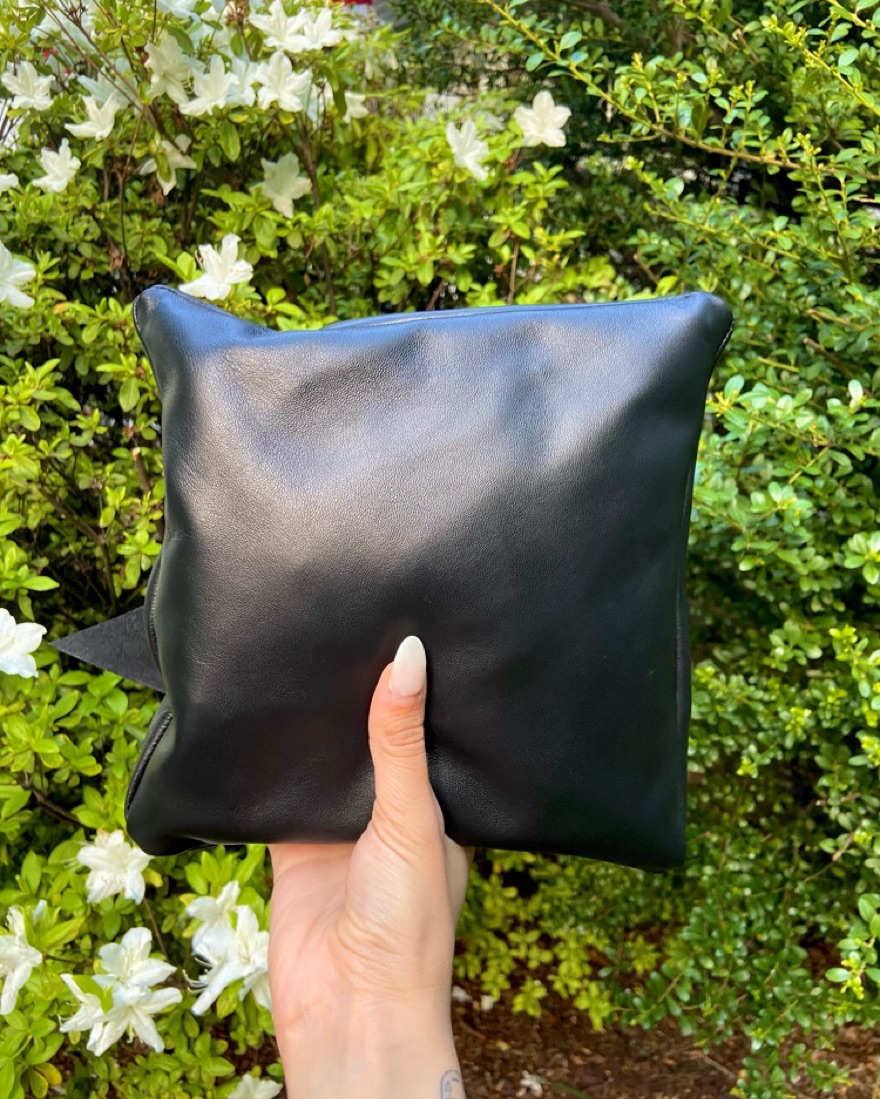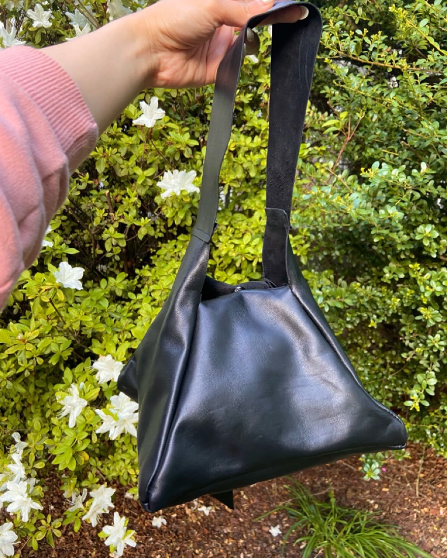 A pyramid shaped purse designed and handmade by me! It’s made of real leather that’s super soft and really good quality. This colorway is a black. There’s more colors available and really cute for going out!