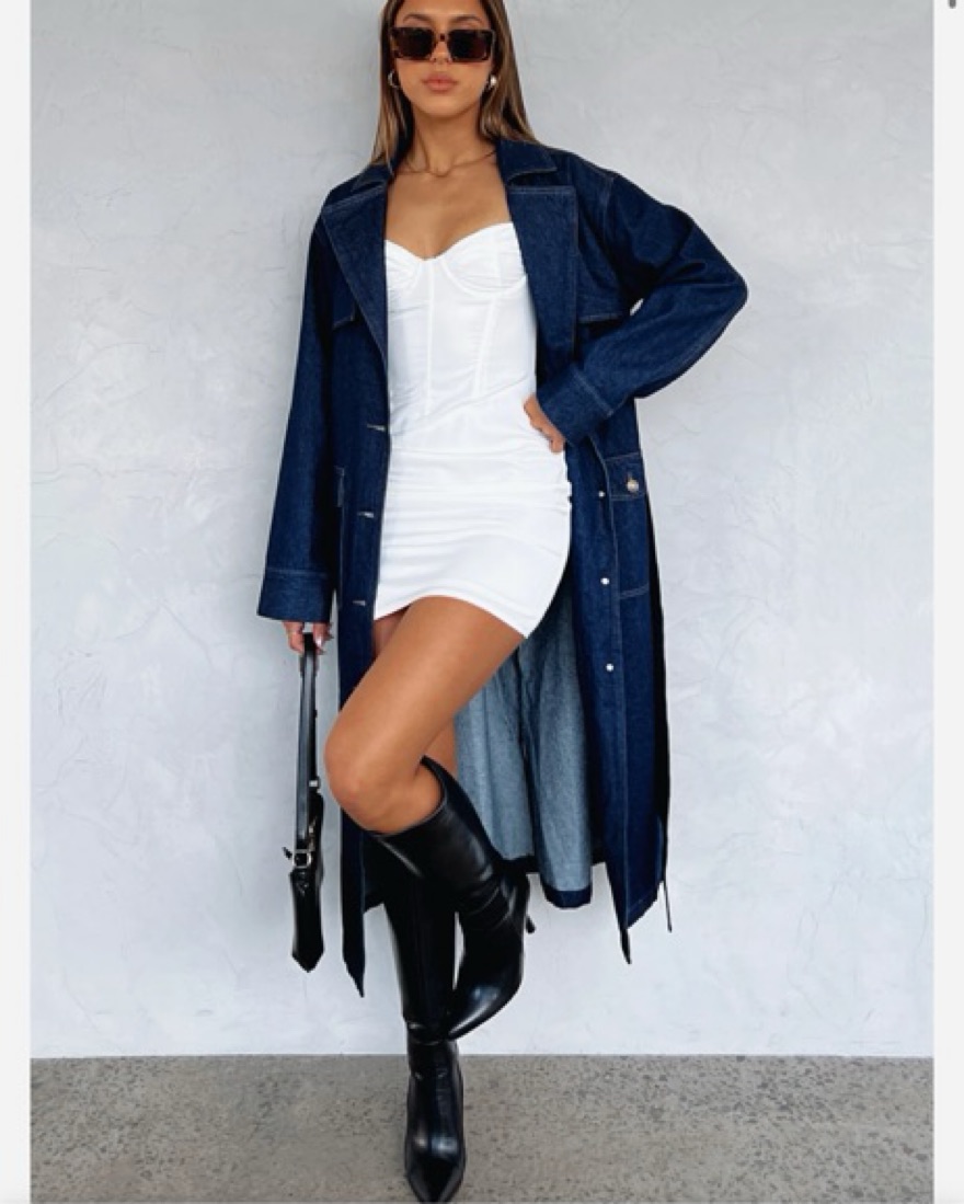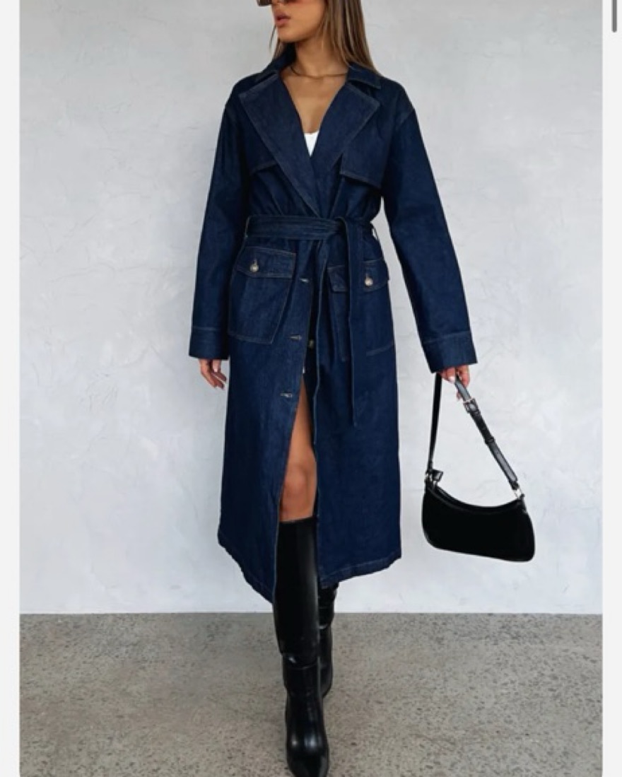 Featuring an oversized fit, wide lapel collar, front button closure, and detachable belt, it combines classic trench coat elegance with contemporary denim chic. Crafted from 100% cotton, this trench coat is perfect for effortlessly stylish layering during colder seasons.