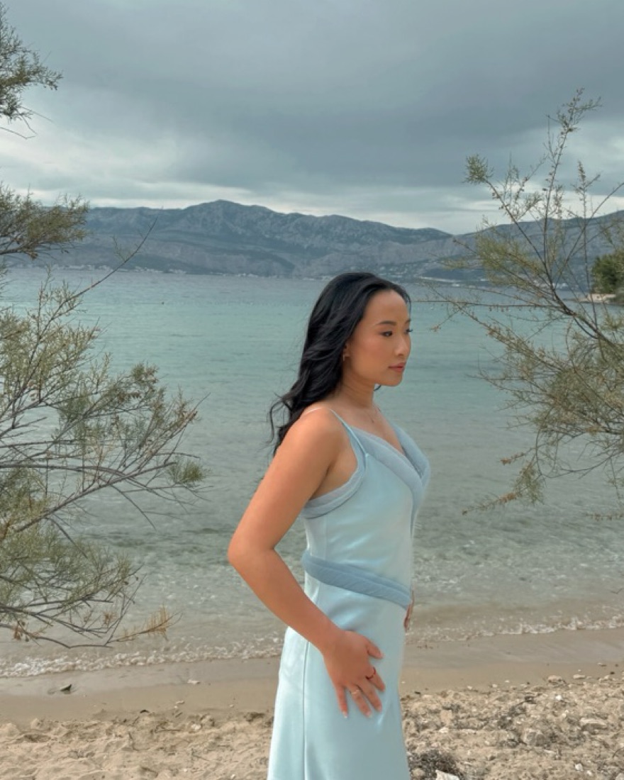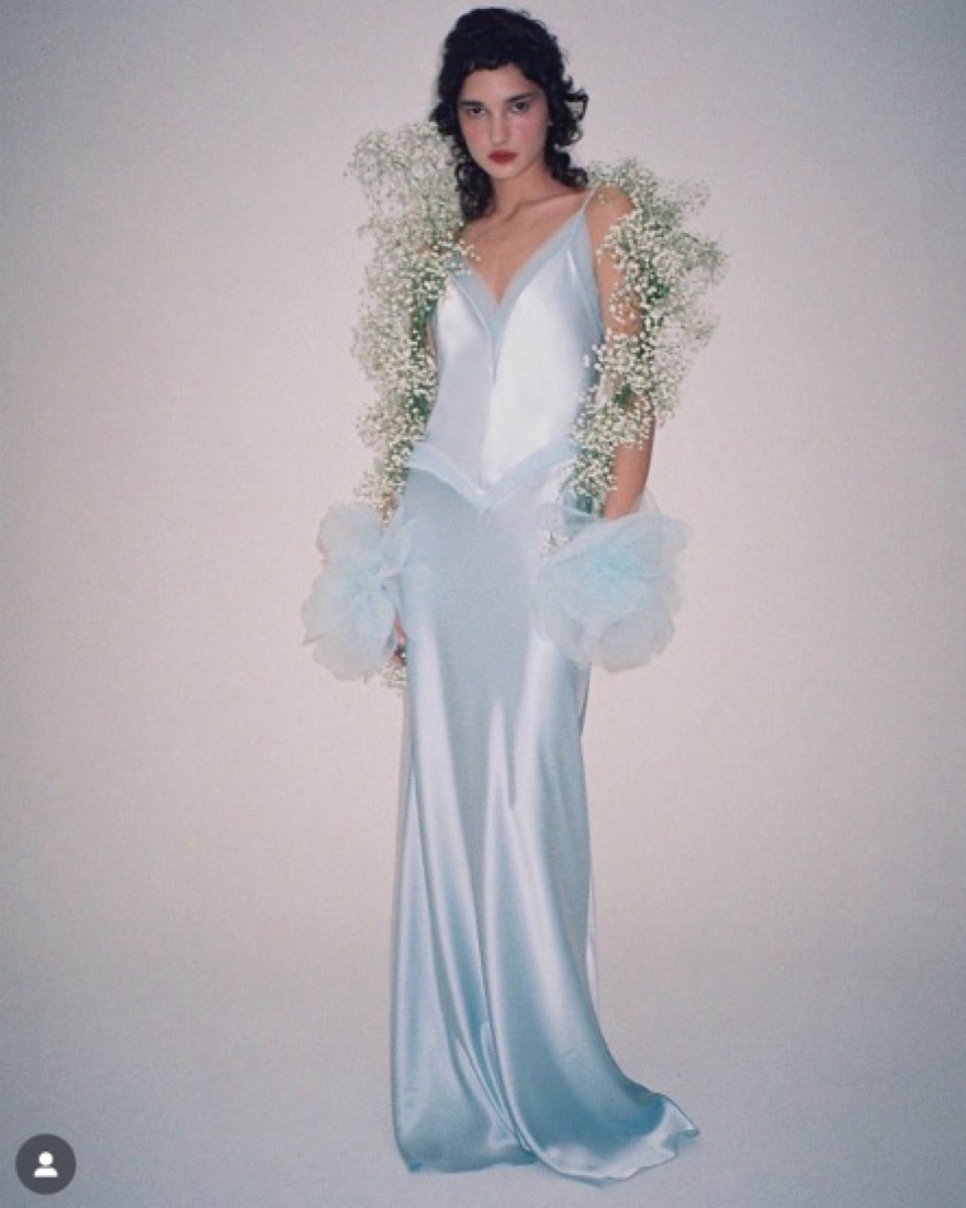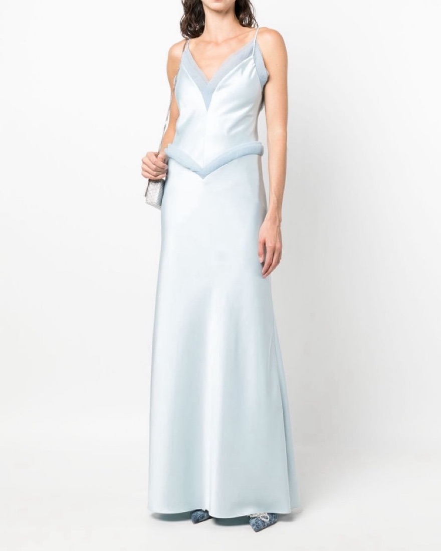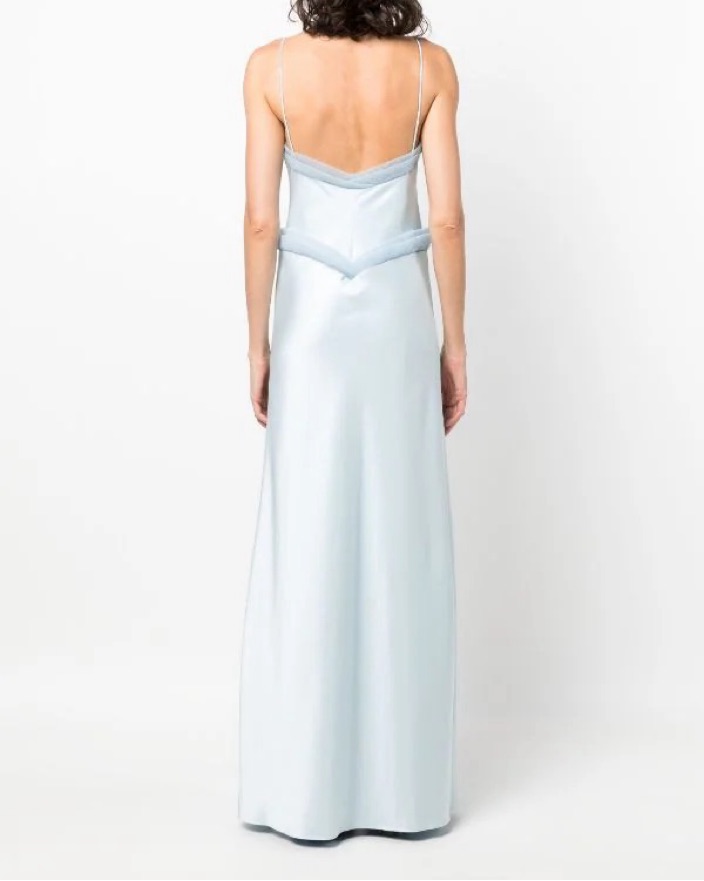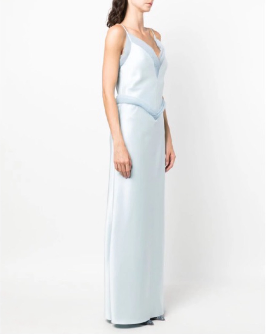 double-lined silk gown with organza V-detail trim. Note I bought the last size available at the time which was too big for me and had it altered to fit me (0, 5’4)