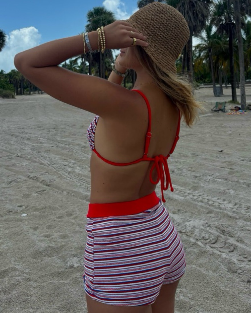 Bikini top and bottom with the matching mini shorts. Top is xs, bottom m and shorts m. Red white and blue stripes. Worn once