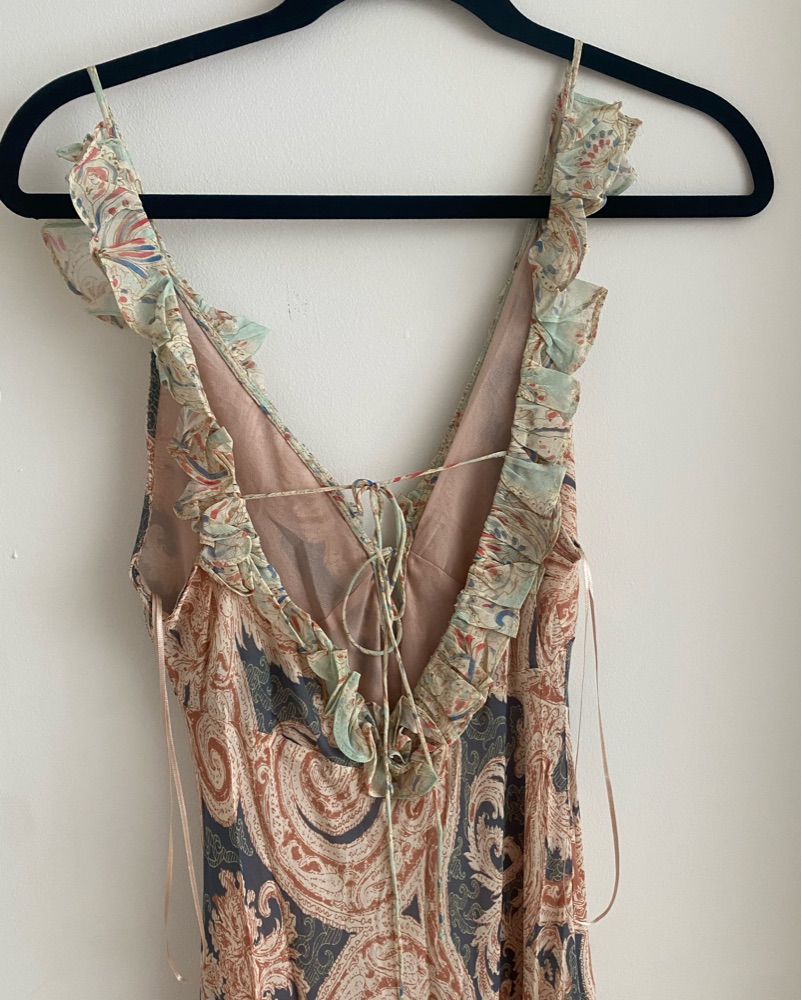 Beautiful multicolor paisley print with delicate ruffles along the neckline and open back with adjustable tie.