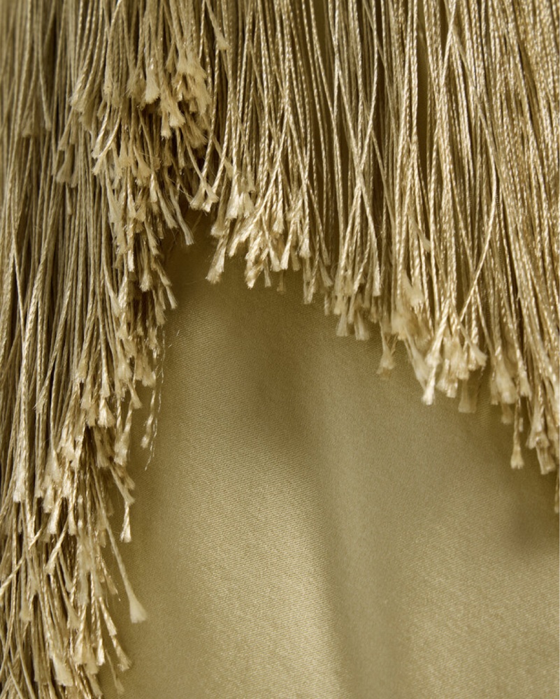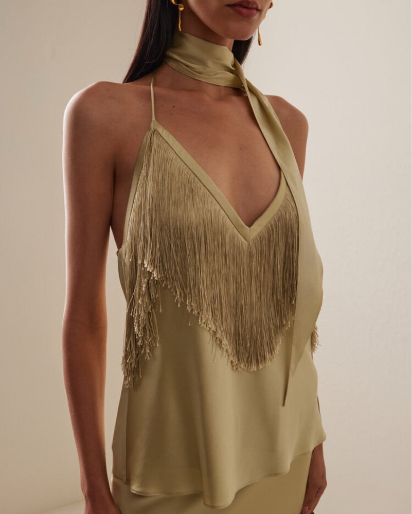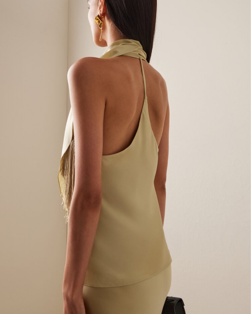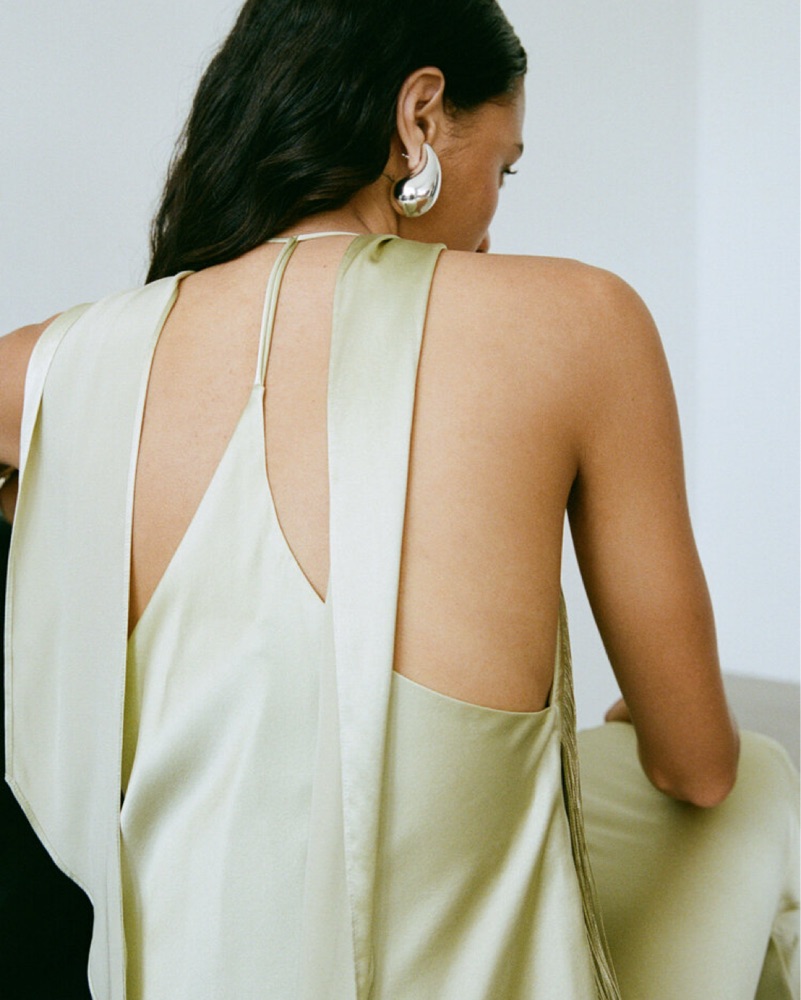 De La Vali Sirocco Top - green silk fringe - scarf neck detail - retails $595 - pistachio green - XS/S