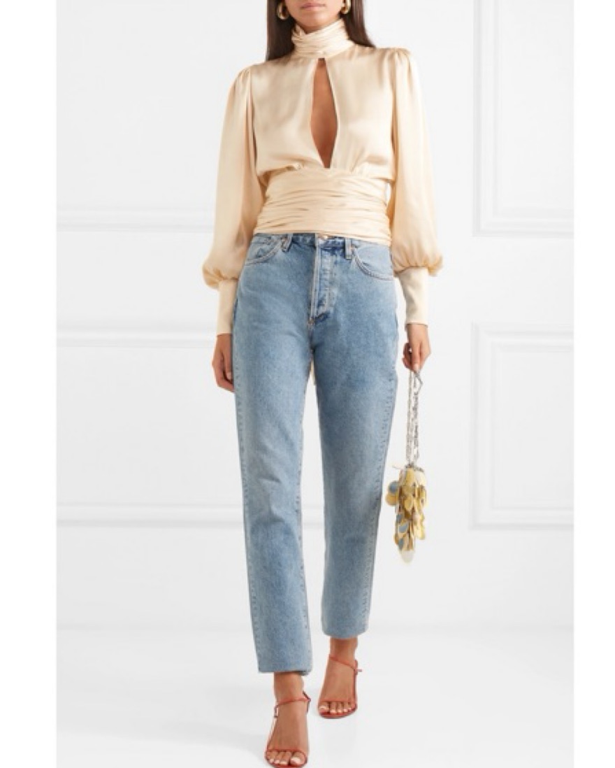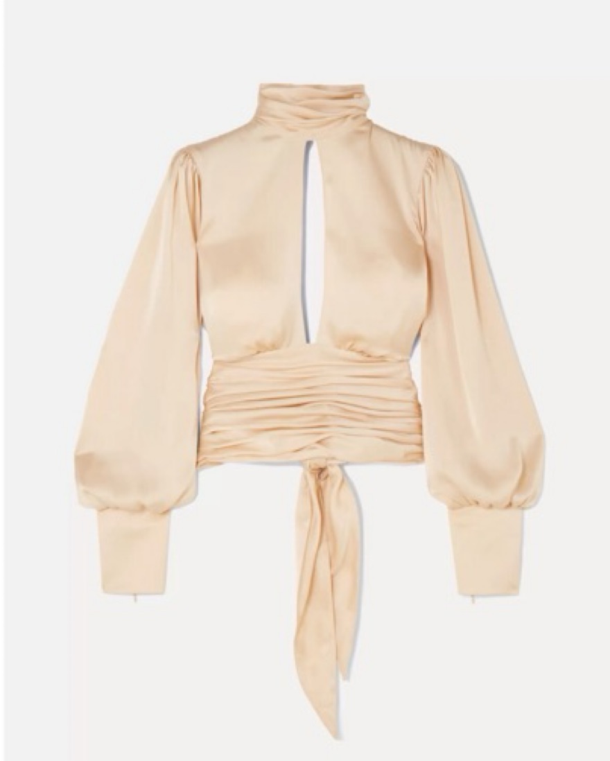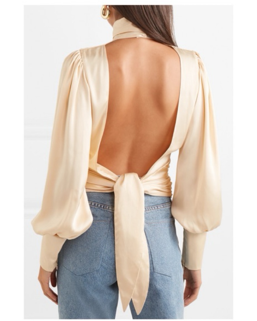 Orseund Iris blouse in the color Champagne with beautiful back tie detail! Very flattering on. I recommend boob stickers and tape to keep everything in place and prevent gaping. Price includes cost of dry cleaning.