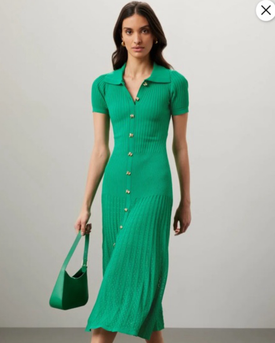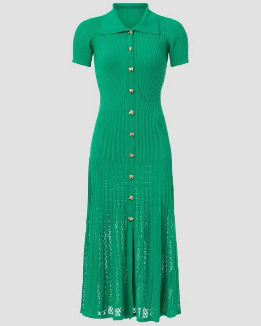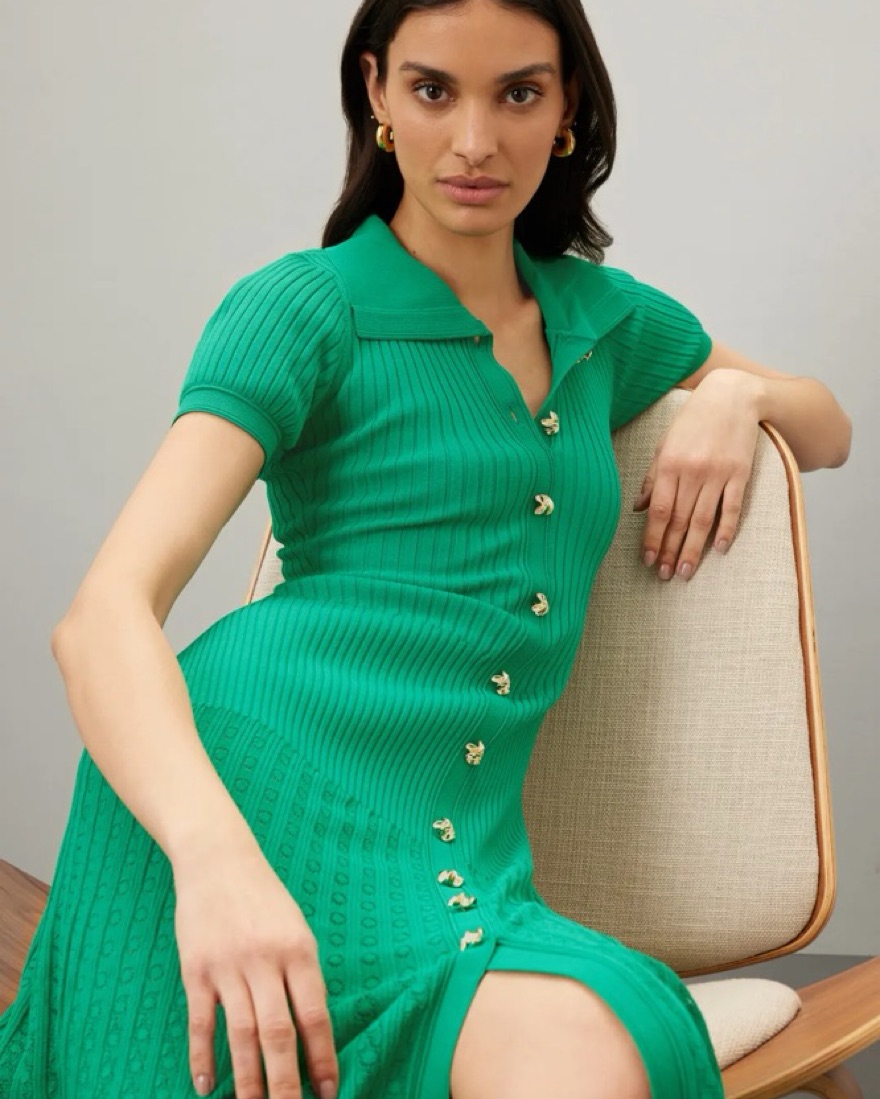 Green Sandro midi dress with gold button detailing.