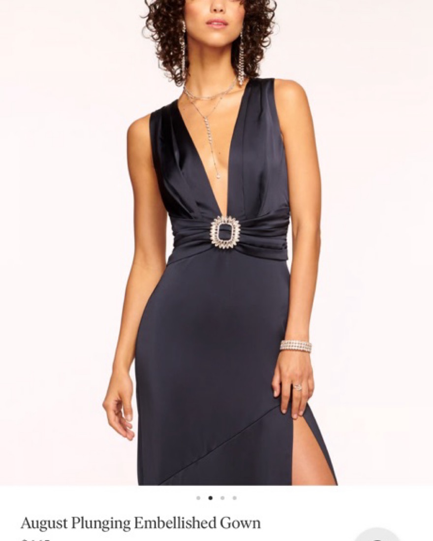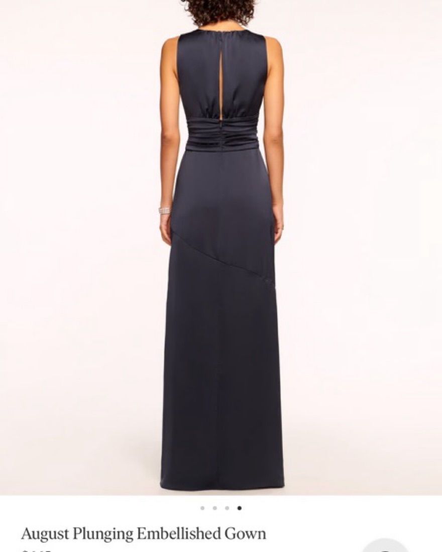 Stunning dress for any black tie event. Classy and subtly sexy. Dress is dark NAVY and appears almost black. Tailored to be floor length for my height 5’4 in 3-4 inch heels.