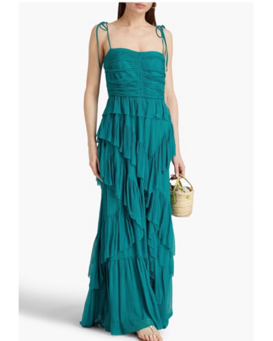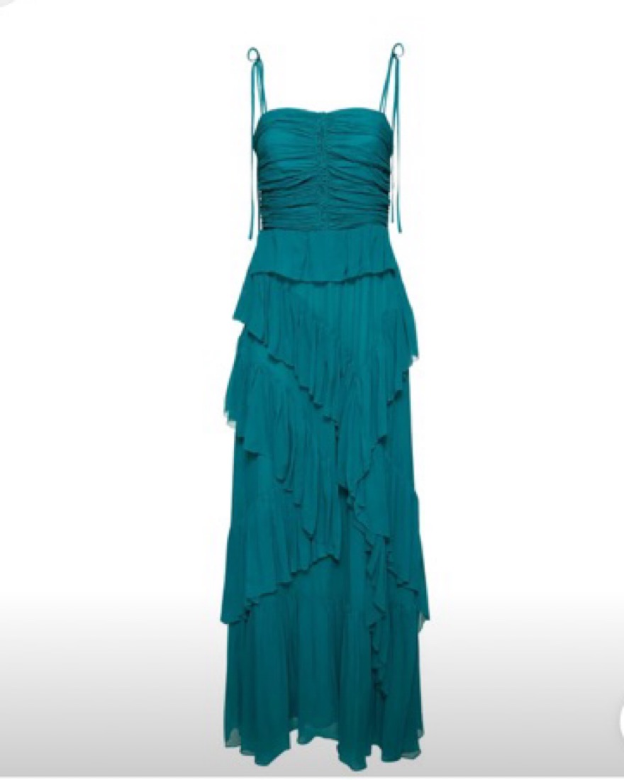This stunning teal maxi dress with its elegant ruched bodice and flowing tiered skirt is perfect for a special occasion like a wedding or formal event.