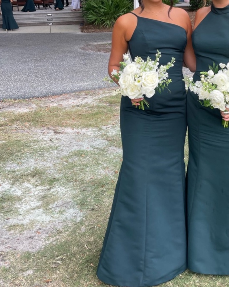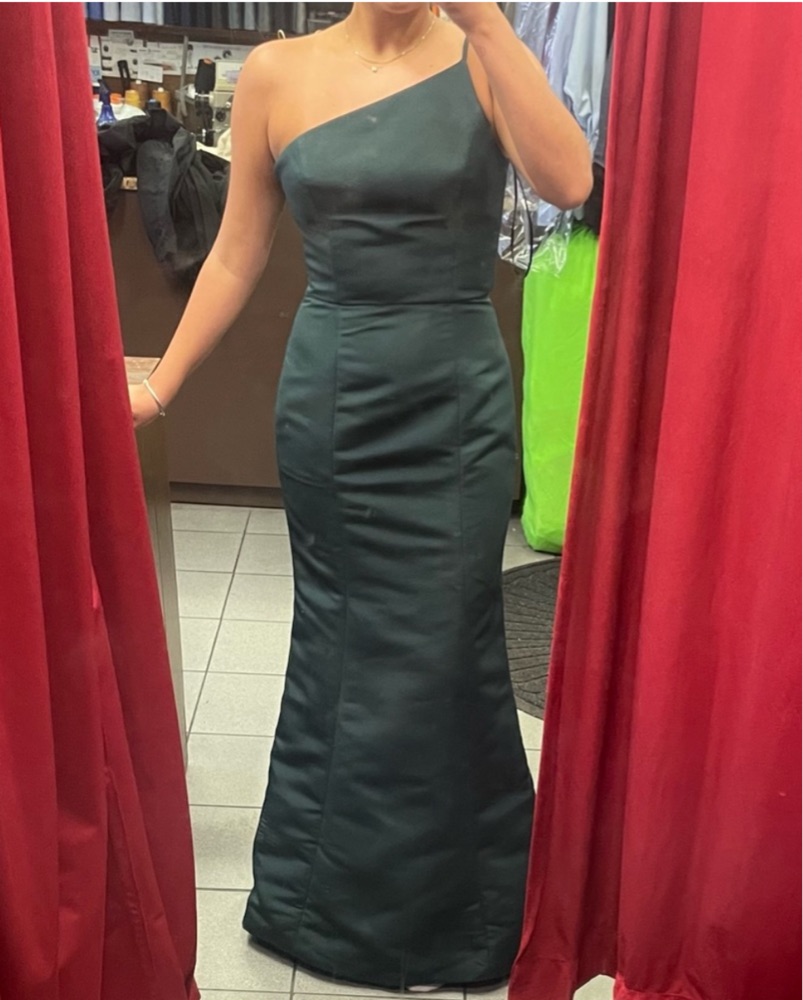 Bella Bridesmaid Hunter Green Dress (the blue is just the photo from the website, the dress is Hunter Green). Altered to fit a 4-6 best, size 26-27” Jean, 5’5” height. Dry cleaned, in perfect condition