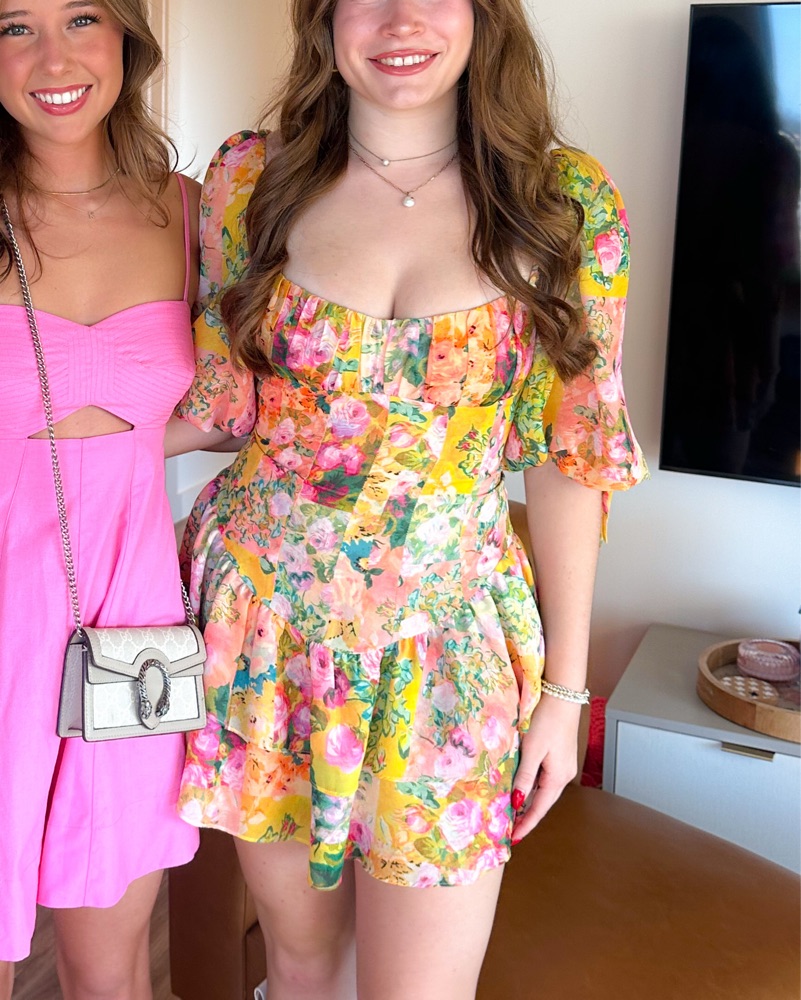 For Love and Lemons Nina Mini Dress in yellow and pink size small! Super flattering and flowy, perfect for summer.